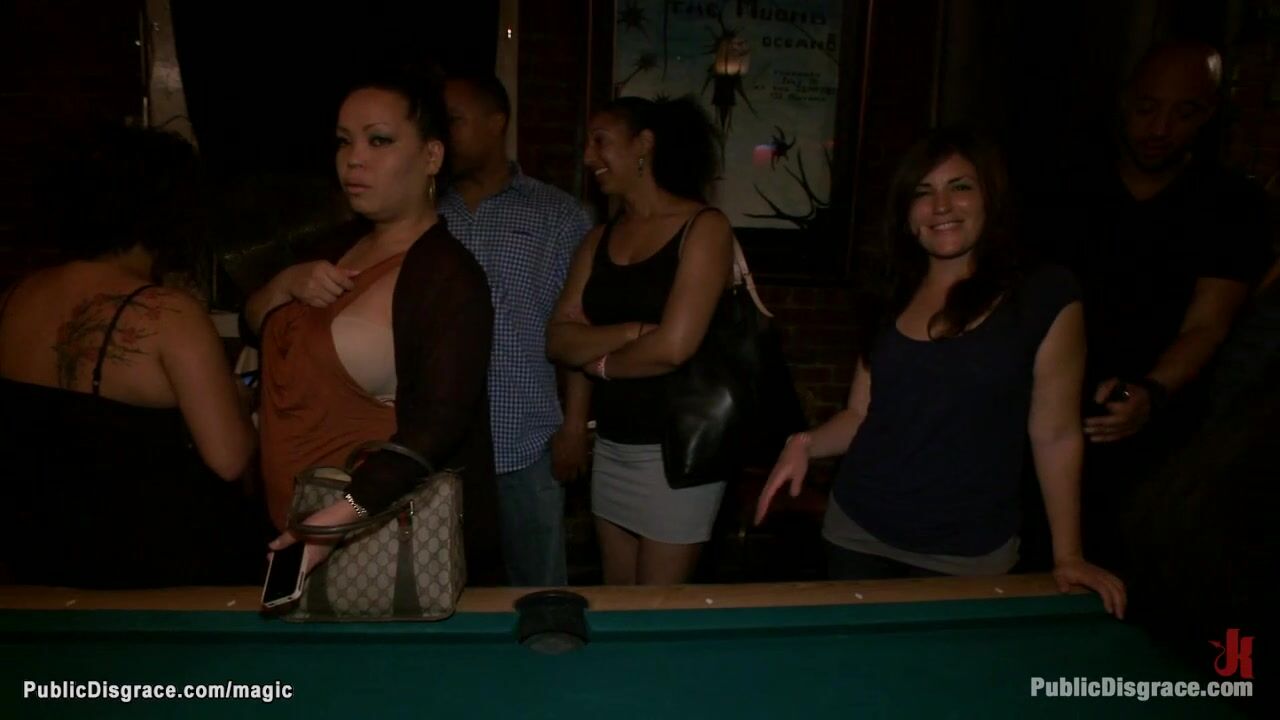 Bent over pool table dirty legs brunette slave Aria Aspen gets pussy rough fucked by big cock Mr Pete in public bar in front of crowd
