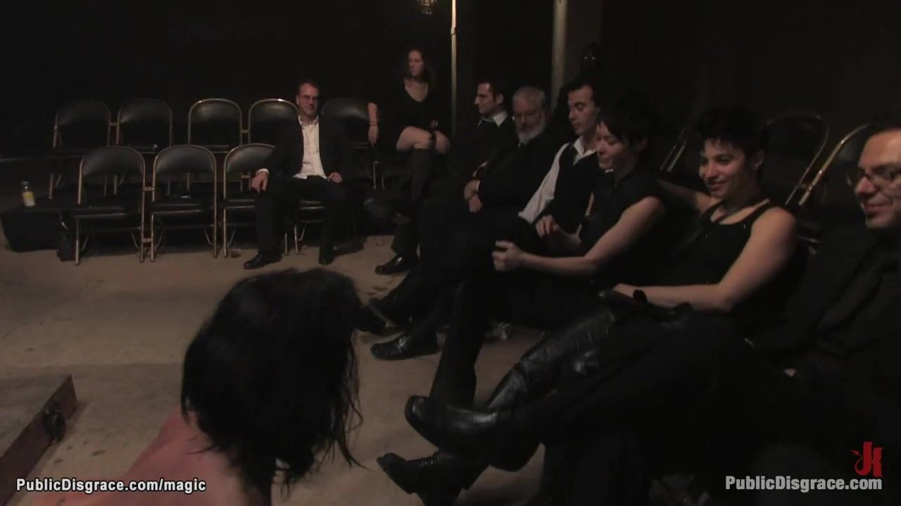 Stunning French brunette slave Cecilia Vega with neck trapped in board gets groped then in inverted suspension fucked in public place
