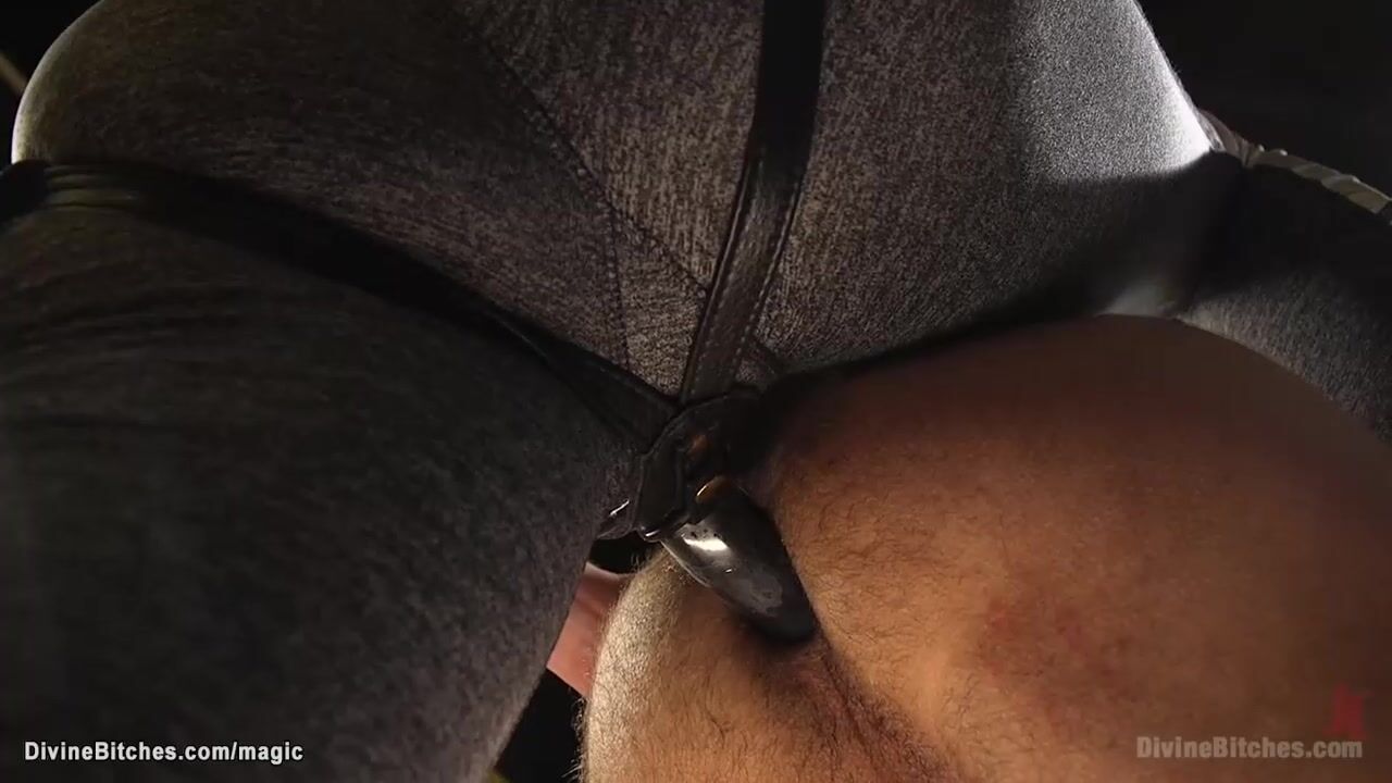 Hot brunette wife in glamorous lingerie Veruca James put in place her submissive rich husband DJ and peg him with strap on cock in the kitchen