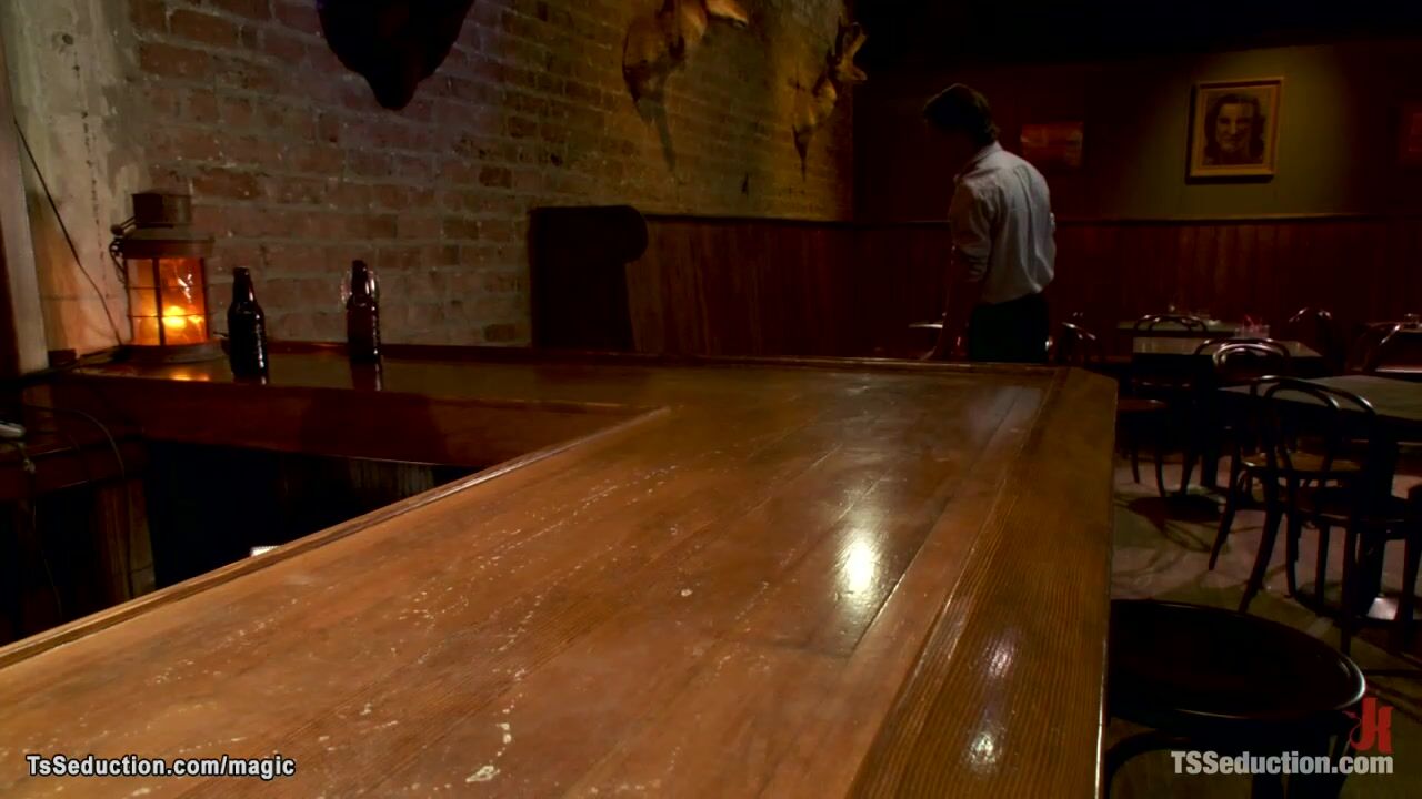 Big tits brunette shemale bartender Ts Foxxy seduces client Chris Archer in her bar and with big cock fucks him in mouth and ass on table