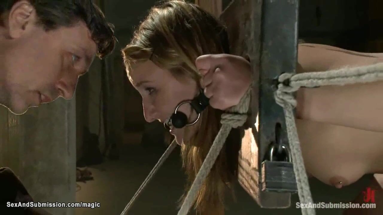 Bound on knees and bent forward with neck and wrists trapped in stock sexy blonde slave Jessie Cox gets anal hooked and ass whipped by master Steve Holmes