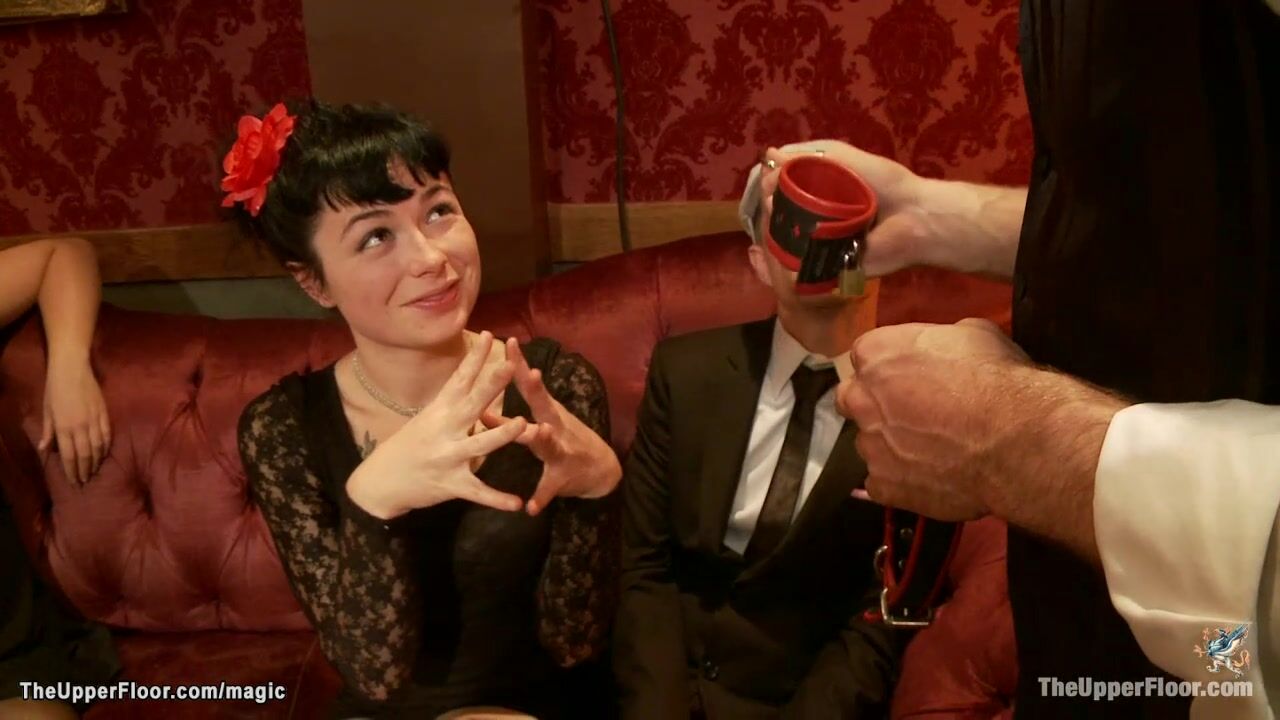 Three hot slaves Claire Robbins and Penny Barber and Danny Wylde together with other service sluts entertain guests at bdsm orgy party in the Upper Floor