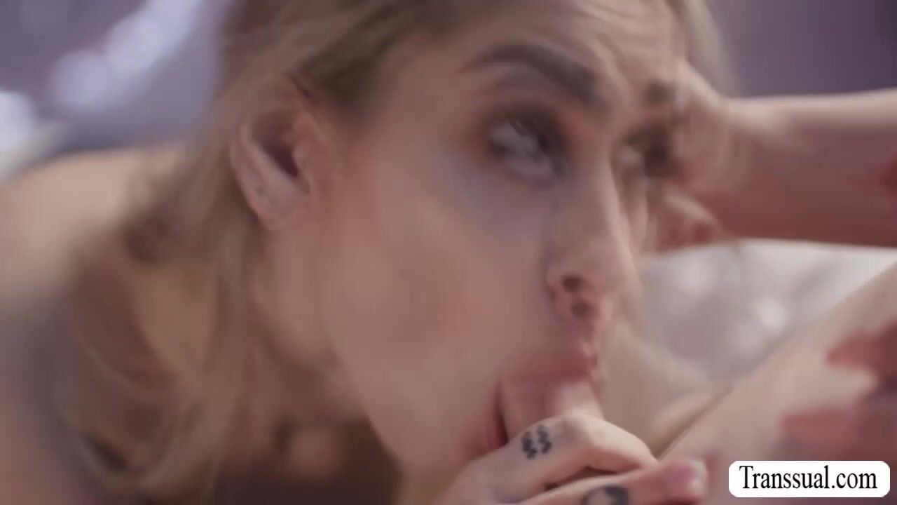 Blonde shemale and her dance partner are on the floor warming up.After that,they get horny and they start kissing each other on the couch.Next is,she lets her horny partner suck her shecock and in return,she licks her pussy first before she fucks it.