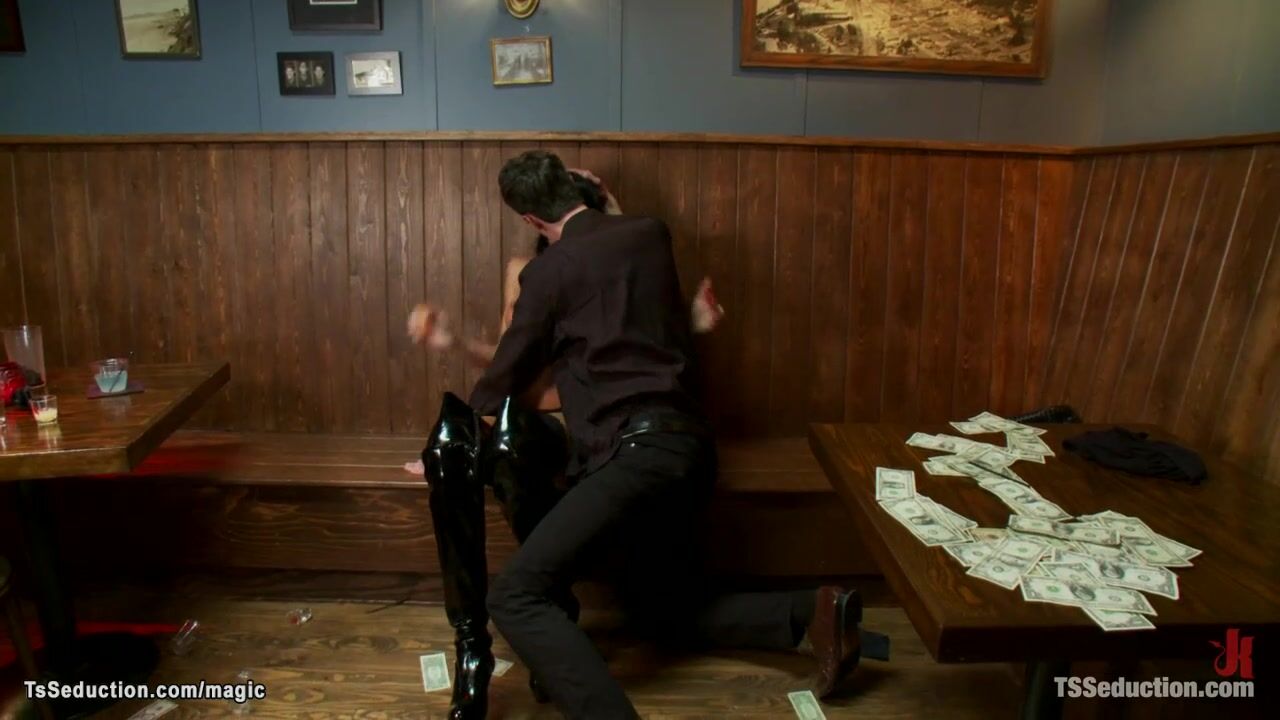 Tall brunette shemale with big tits Morgan Bailey gives blowjob to bartender Chris Ockham then with big dick fucks him in mouth and ass in his bar
