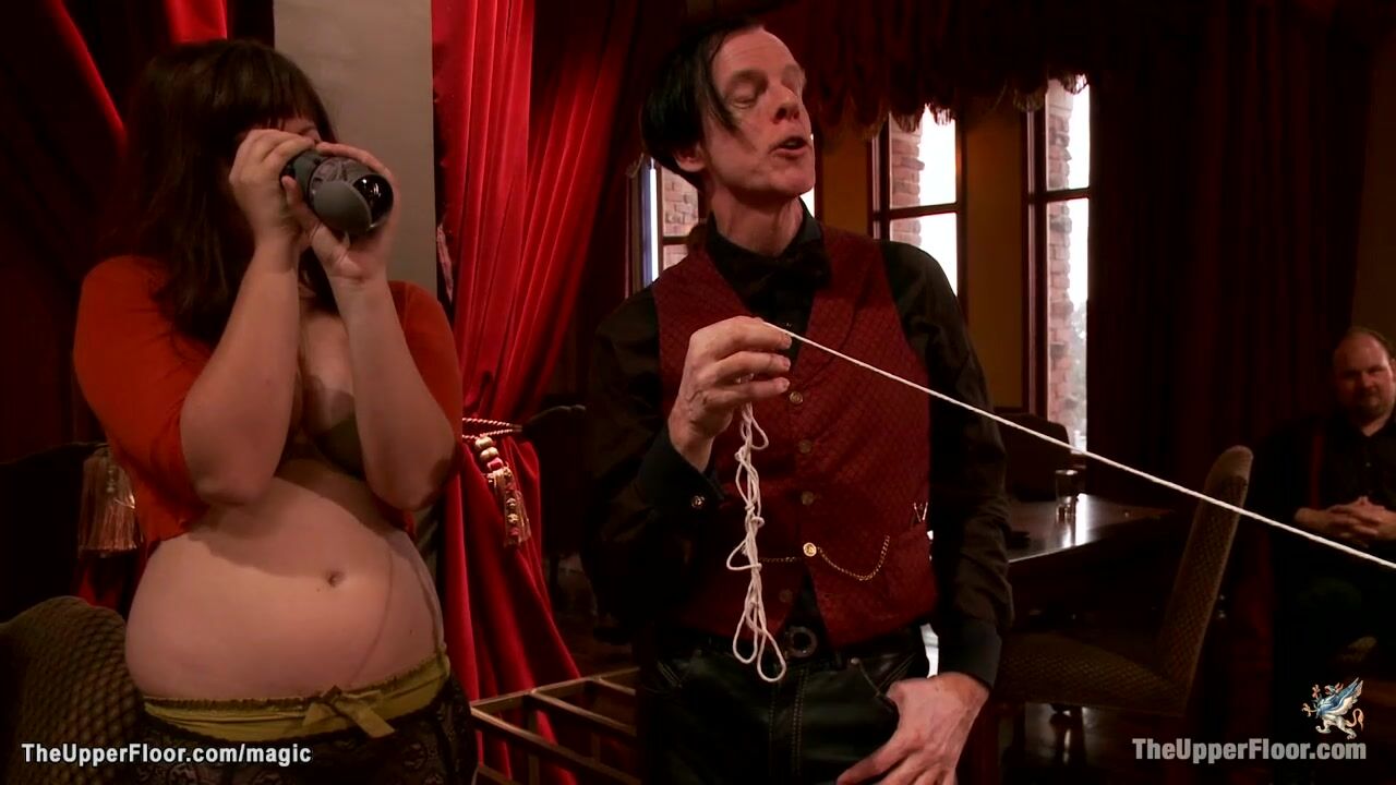Bound newbie service slut Casey Calvert and big tits Bella Rossi are mounted on dildo then rough anal fucked by big cock at bdsm orgy party in the Upper Floor