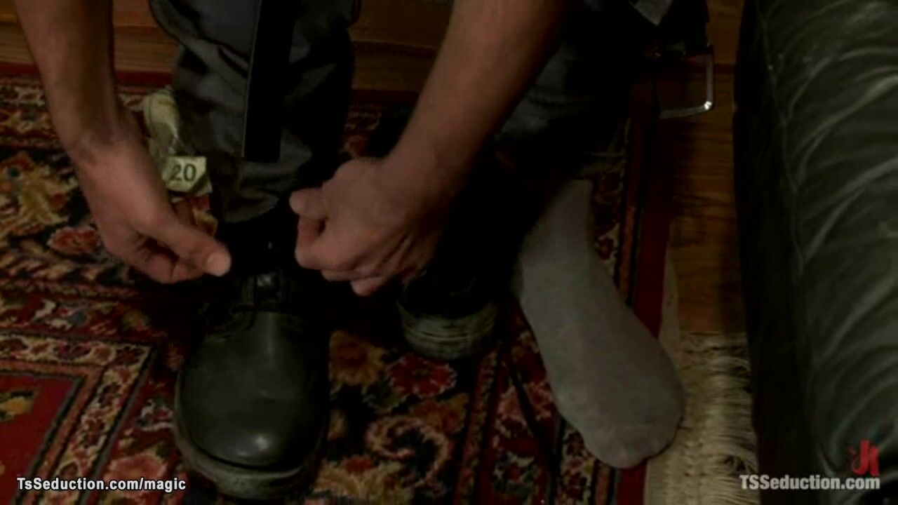 Hot blonde shemale with big tits in black lingerie Paris A makes courier John Jammen strip then binds and fucks him and wanks his dick till cum