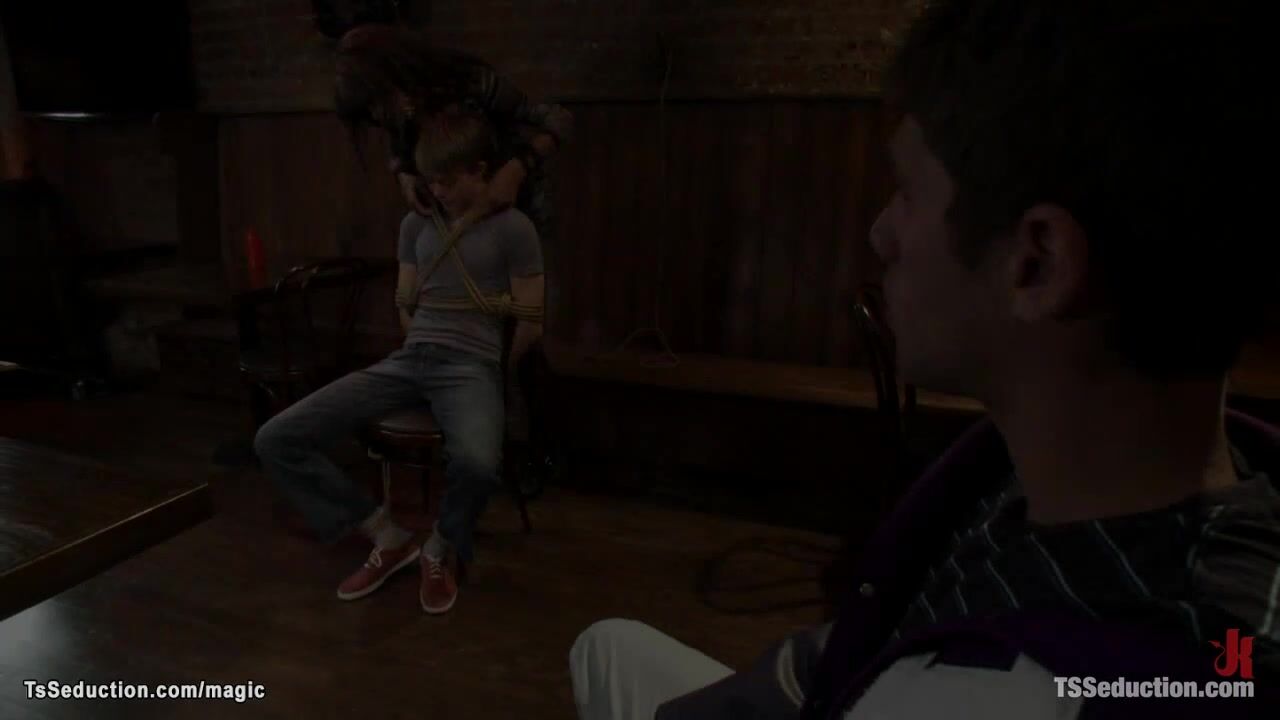 Huge tits Asian shemale bartender Yasmin Lee binds two sports man students Koby Fox and Robert Bridges and with big cock fucks them and makes cum