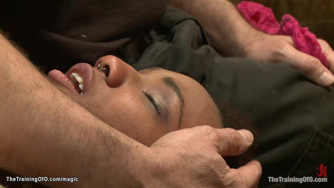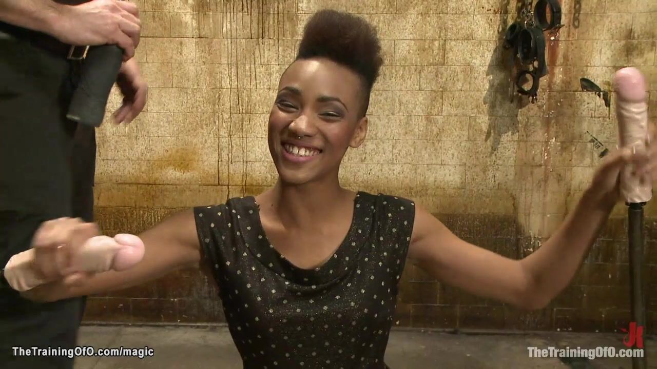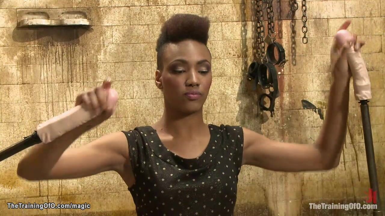 Slim ebony slave trainee Nikki Darling wanking two dildos on a sticks then gets bound and whipped till made squat on dildo by master James Mogul