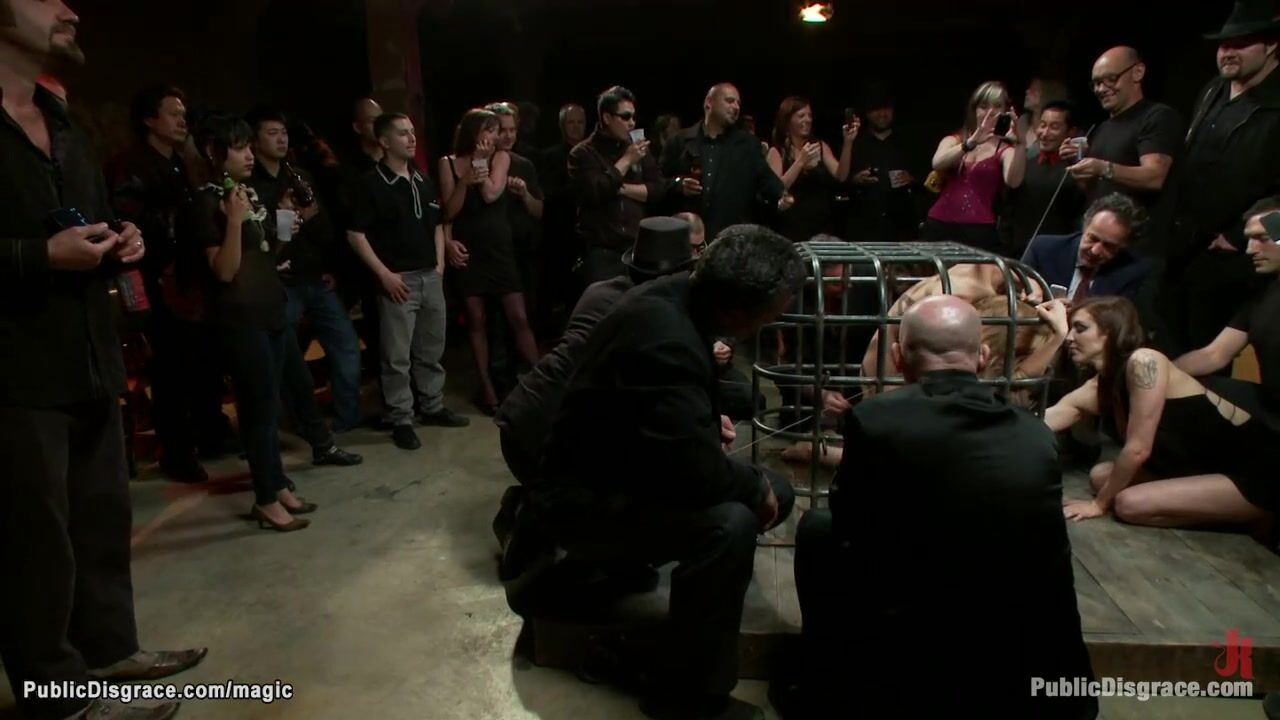 Locked in small cage busty blonde slave Audrey Rose gets skin clamped and pulled by strangers then rough whipped out of cage and gang bang fucked in public