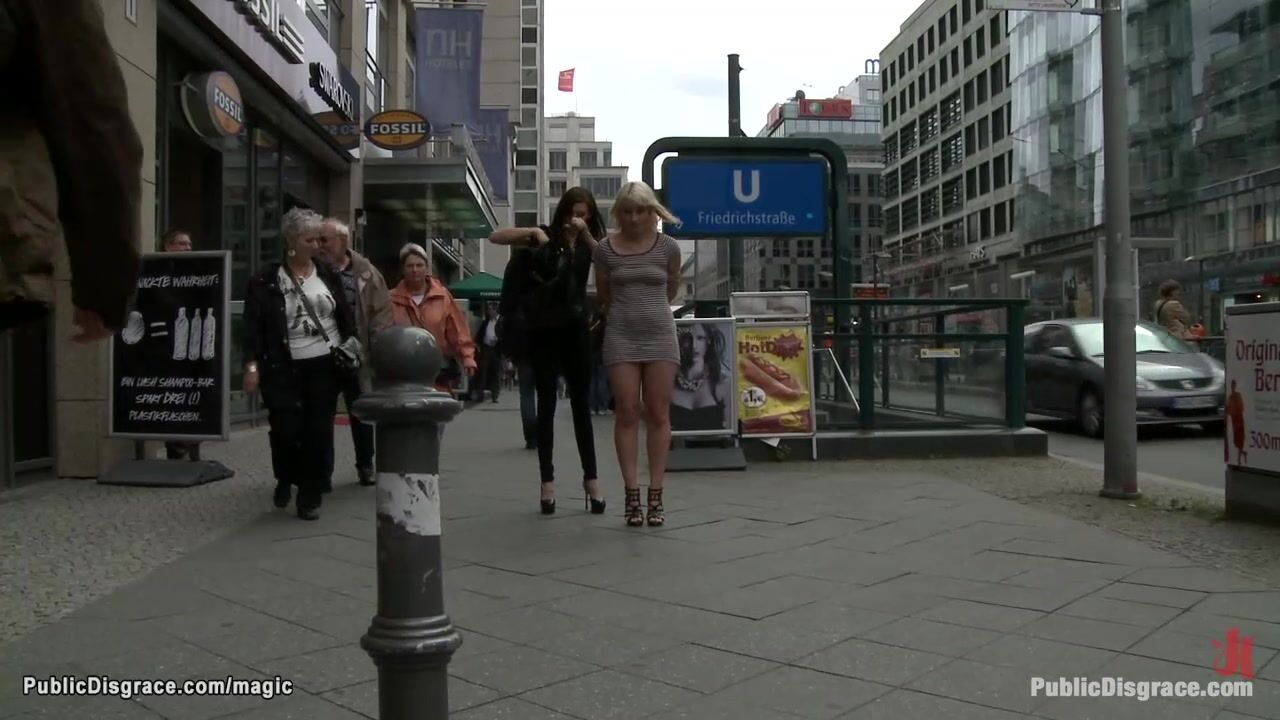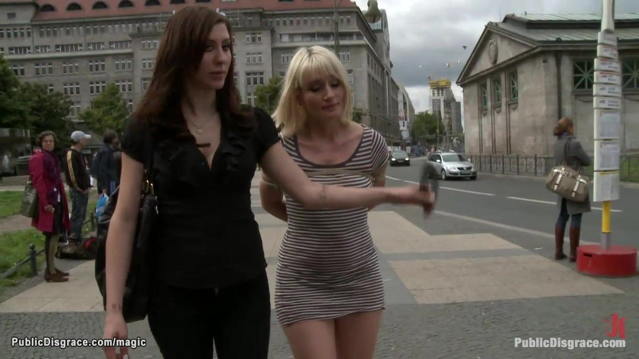 Lezdom Princess Donna Dolore walks bound German blonde babe Uma Masome in public crowded streets then Steve Holmes fucks her with strangers with big cocks
