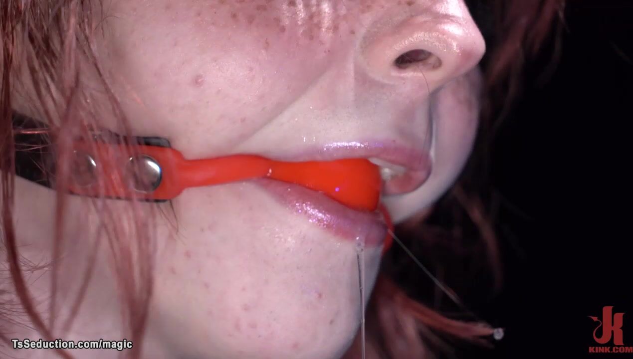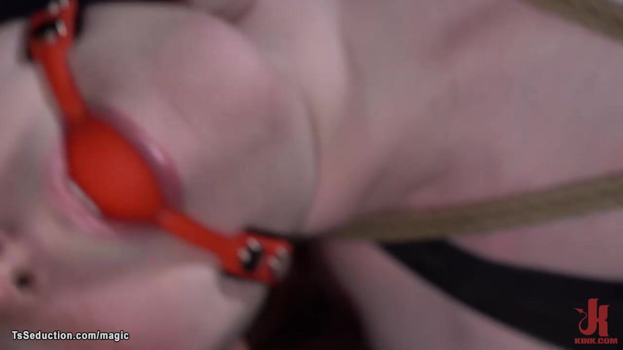 Hot redhead shemale slave Ella Hollywood in latex kinky lingerie gets gagged and bound then gets her fists suspension from master Ruckus