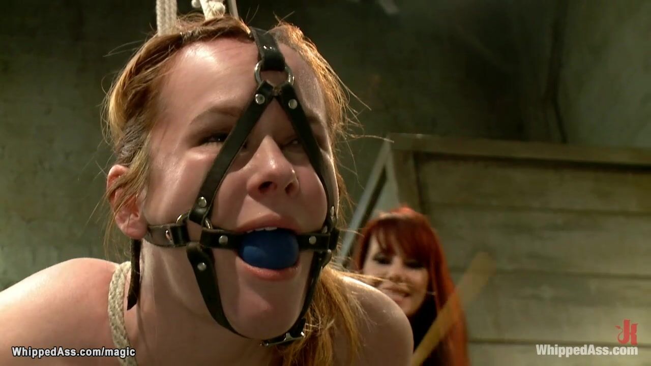 Resident lezdom Maitresse Madeline Marlowe binds and mounts on sybian redhead lesbian slave Claire Robbins and whips her hard then sits on her face