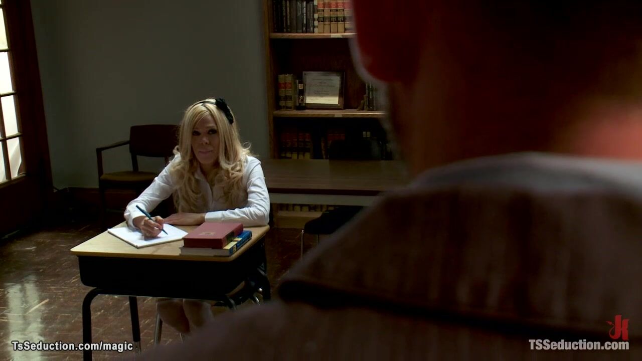 Blonde shemale student Paris A seduces English professor Rom Fox and sucks his big cock then bend him over desk and anal fucks balls deep in classroom
