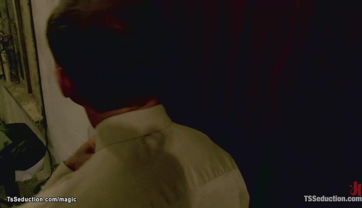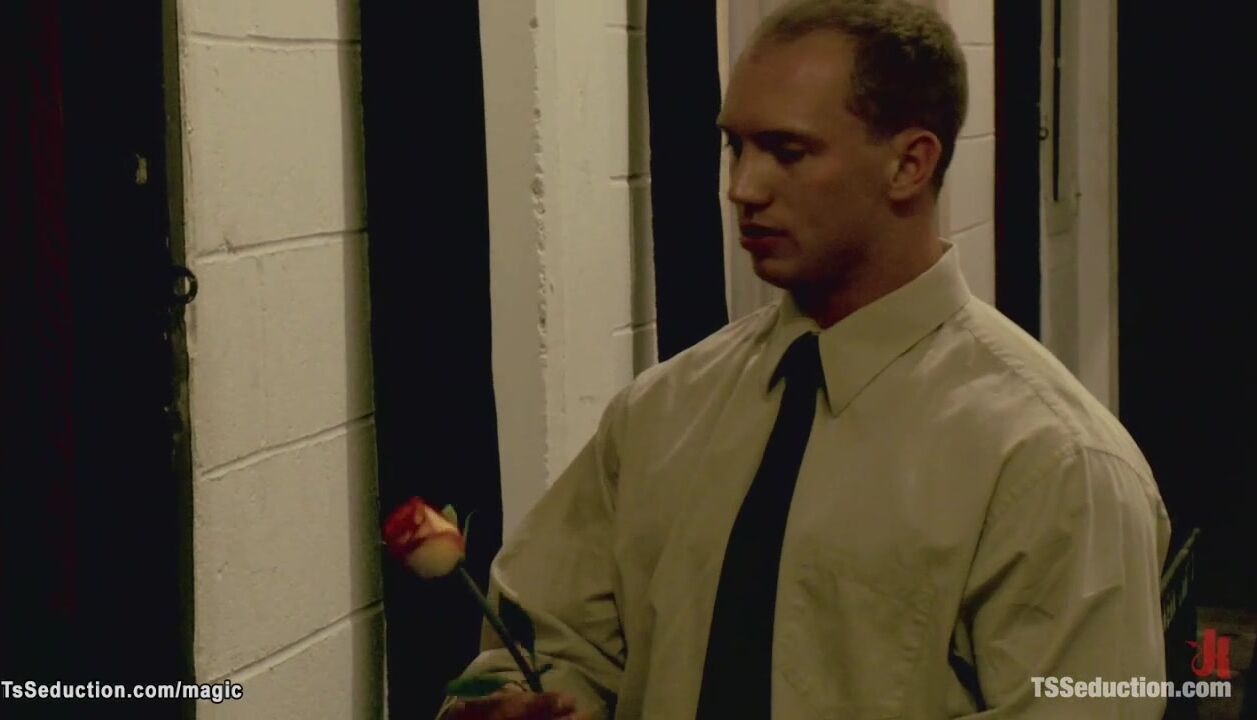 Biggest fan John Magnum of blonde mature shemale star Johanna B visits her and gives her a rose then she binds and anal fucks him in bed