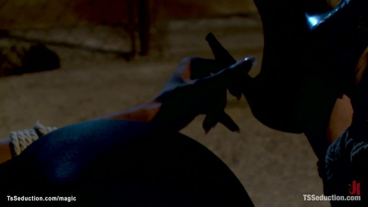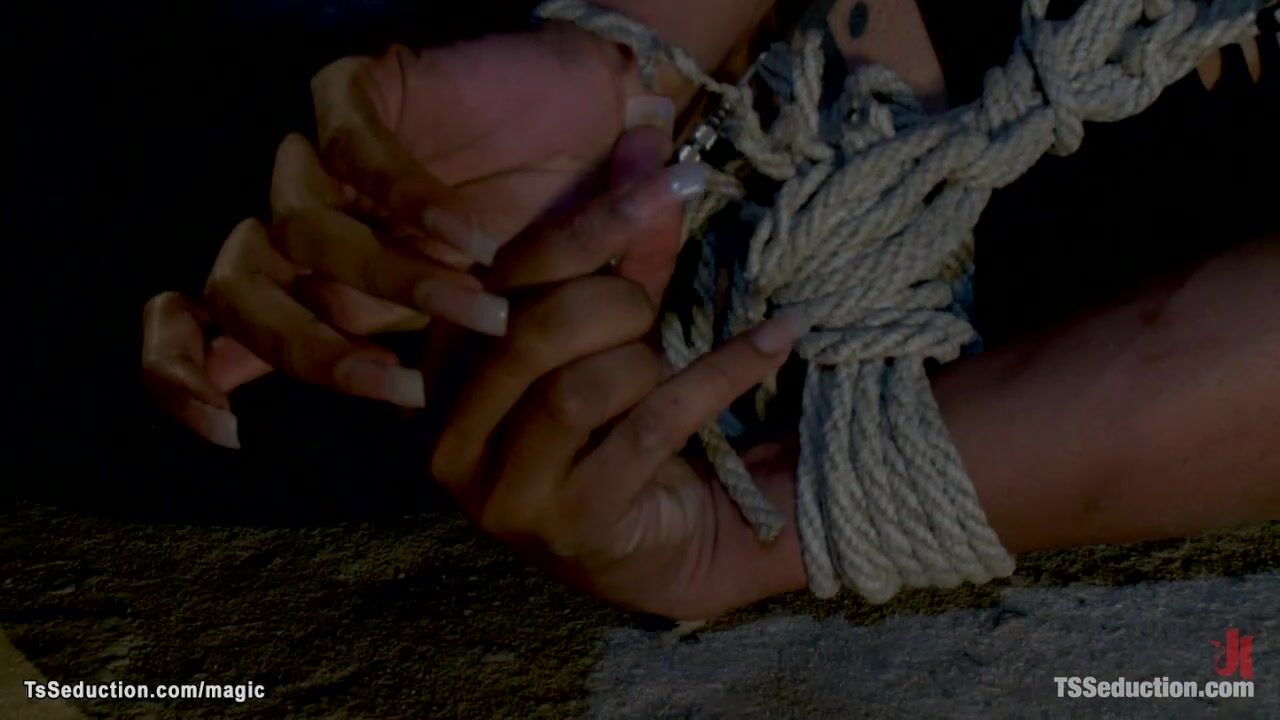 Bound and left river side two shemales Honey Foxxx and Sexy Jade escape and follow thug Vince Ferelli to his hotel room and there fuck him in bondage with big dicks