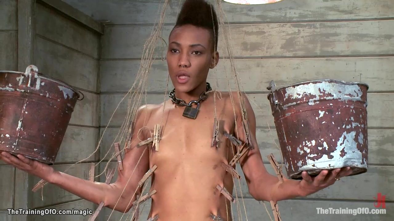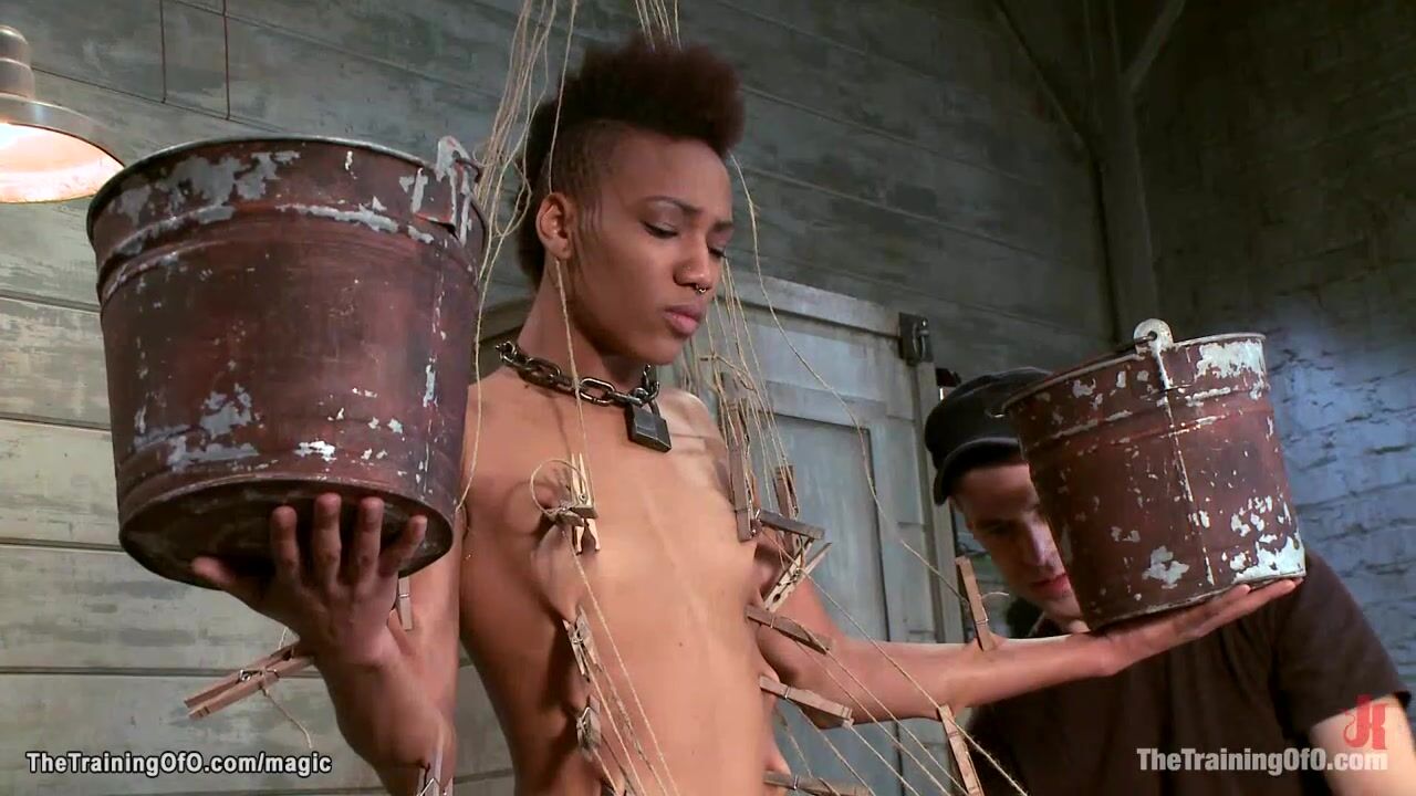 Lean small tits ebony slave trainee Nikki Darling trained by master James Mogul and made hold heavy buckets and ride vibrator and get whip