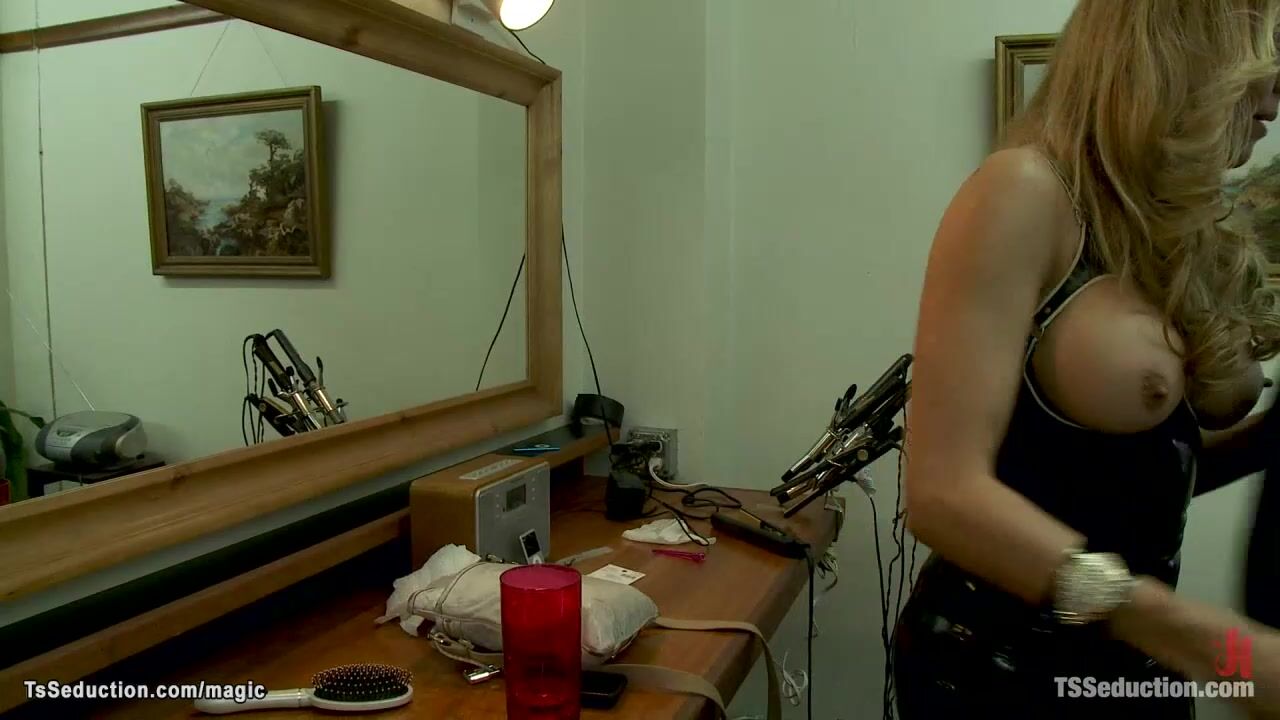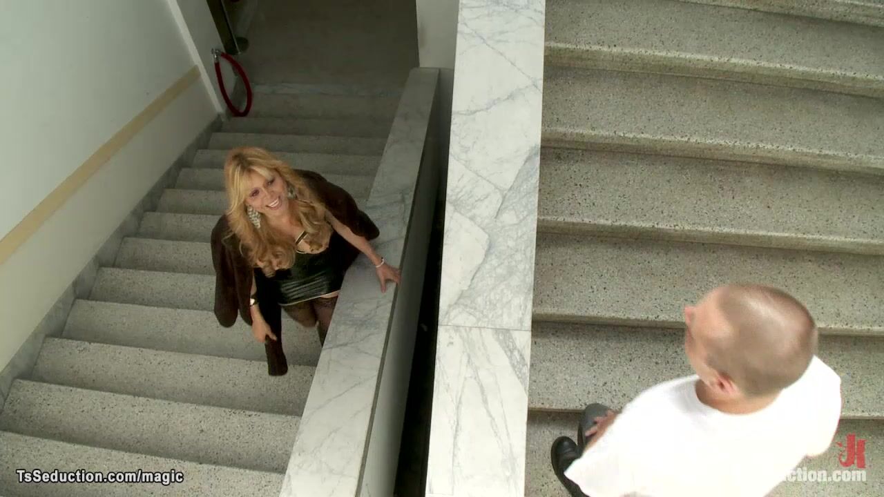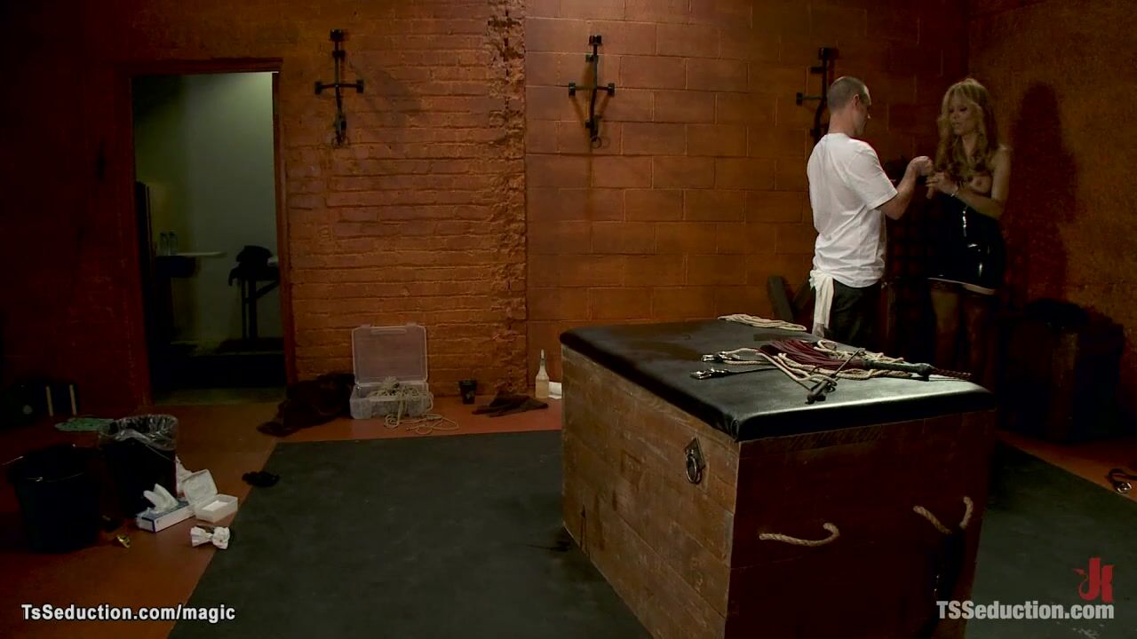 Big boobs hot blonde mature shemale dom Johanna B picked up maintenance guy John Jammen and brought in dungeon where anal fucked him in bondage