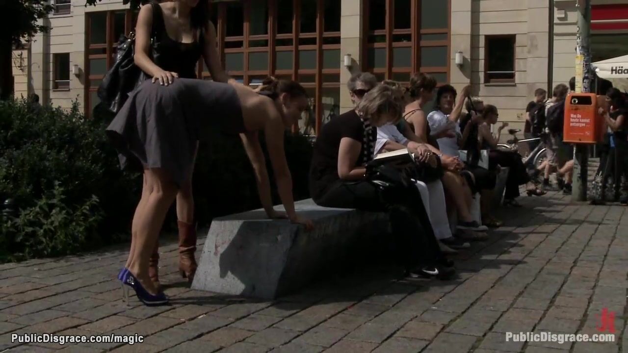 Hot MILF lezdom Princess Donna Dolore exposes and spanks German babe Black Lady then with big cock Tommy Pistol fucks her outdoors in public