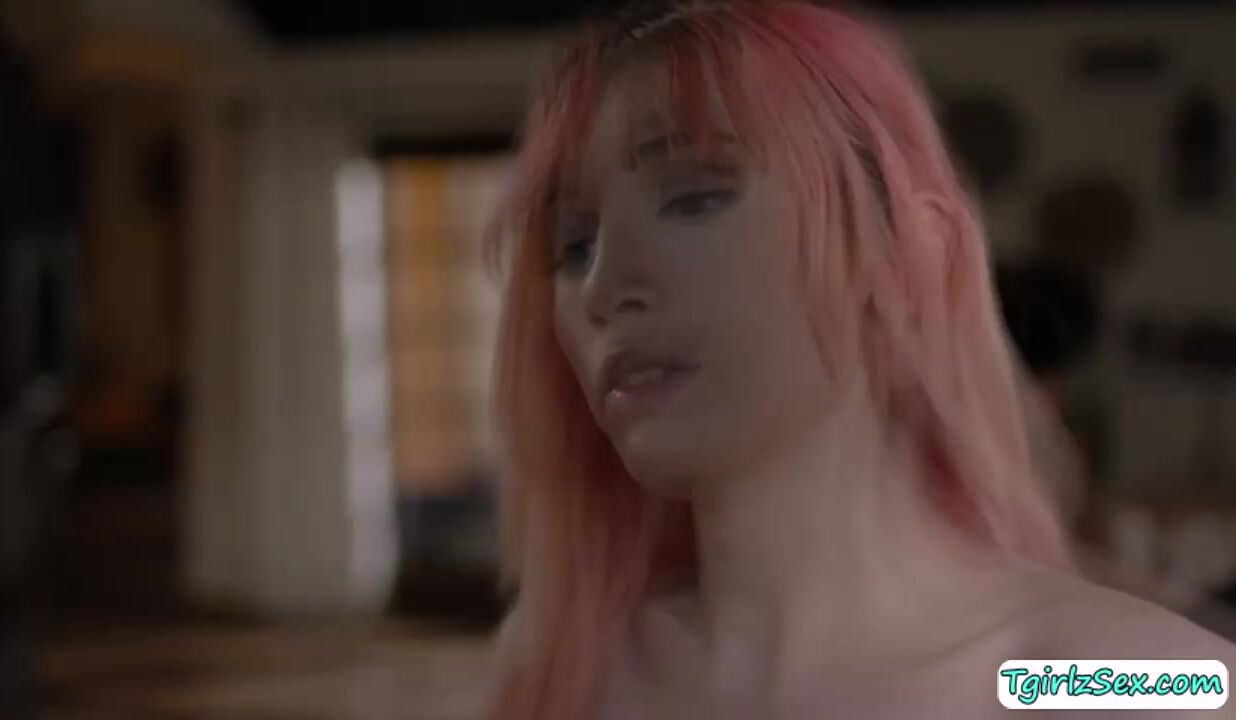 In the living room, busty shemale Mimi Oh flirts and playfully strokes tattoed Ruckus big cock before she whips it out for a mouthful deepthroat blowjob. The big tits tbabe moans in orgasm as she rides his huge dick in hardcore anal bareback after rimjob.