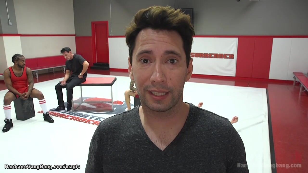 Five wrestlers take big natural boobs brunette babe Arabelle Raphael and with big dicks gang bang and double penetrate big ass tattooed hottie in the gym