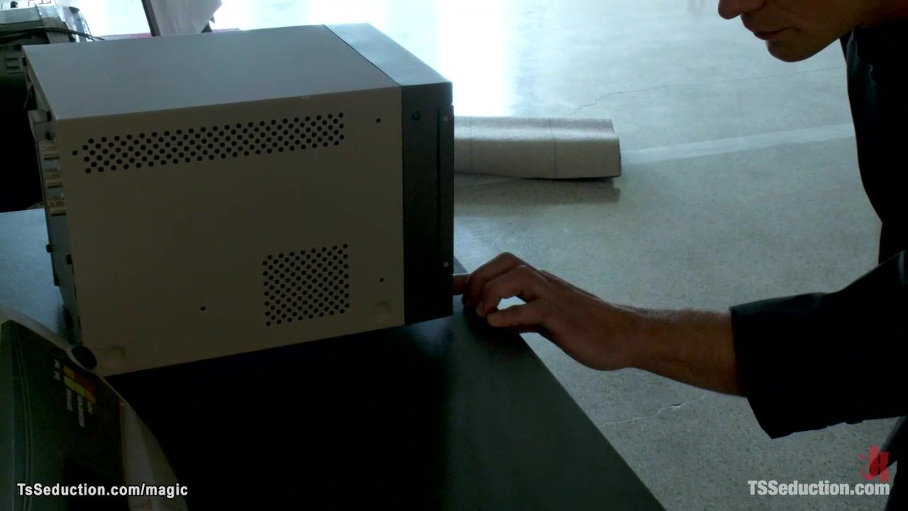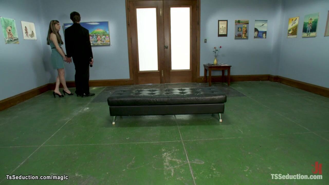 Sexy shemale Aly Sinclair seduces security guard Chris Archer in local gallery and sucks his big cock while he is in handcuffs then anal fucks him with big cock