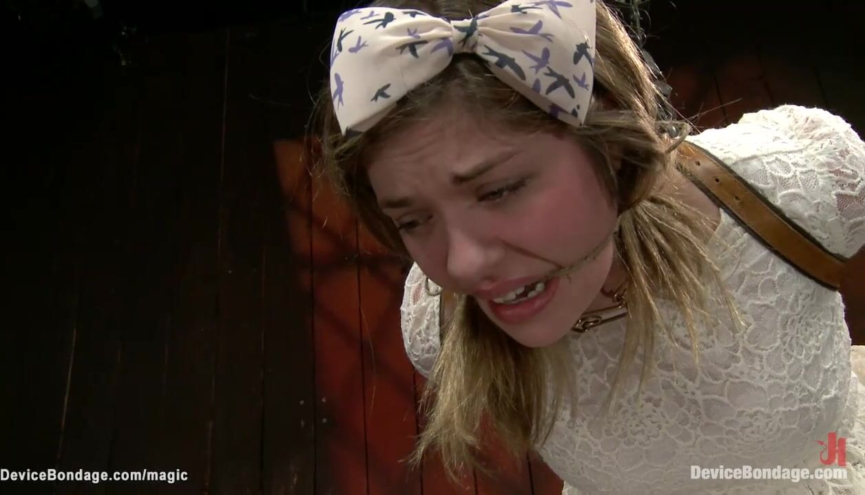 Gagged lesbian slave in white dress Lia Lor bound in strict leather arm binder in strappado then on the floor bound in wooden stocks and caned by lezdom Claire Adams