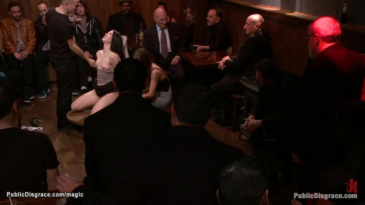 Brunette slave Cheyenne Jewel bound down on knees and gagged with fist then in doggy position with boxed head pussy fingered in public