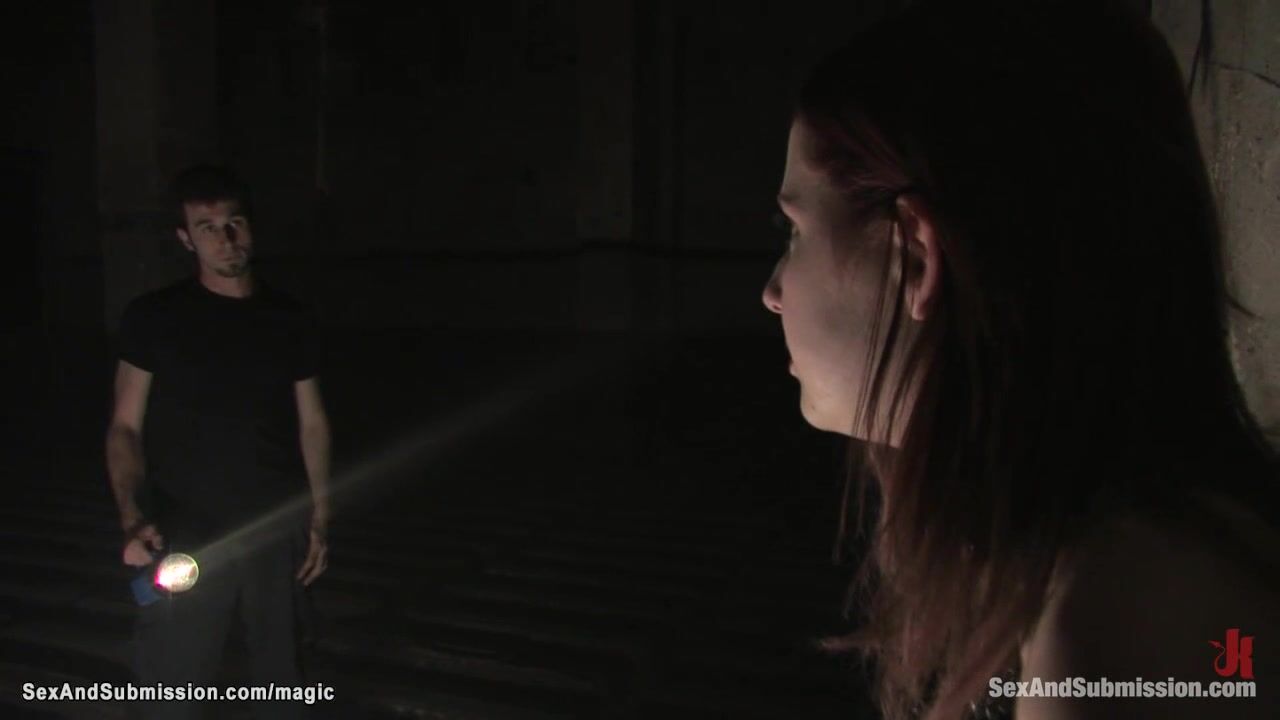 Redhead slave Megan Murray chaied to the wall in squating position and gets whipped then suspended above bed and bound to device big dick fucked by James Deen
