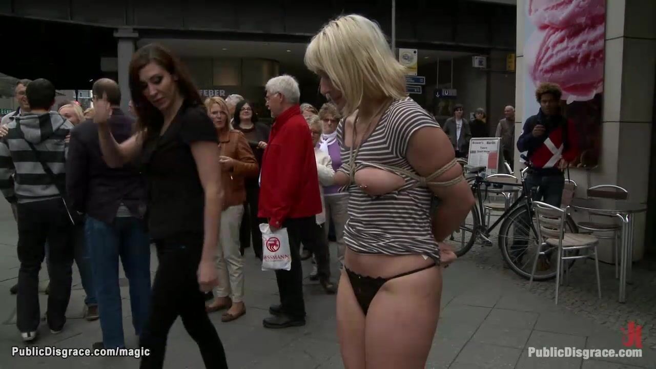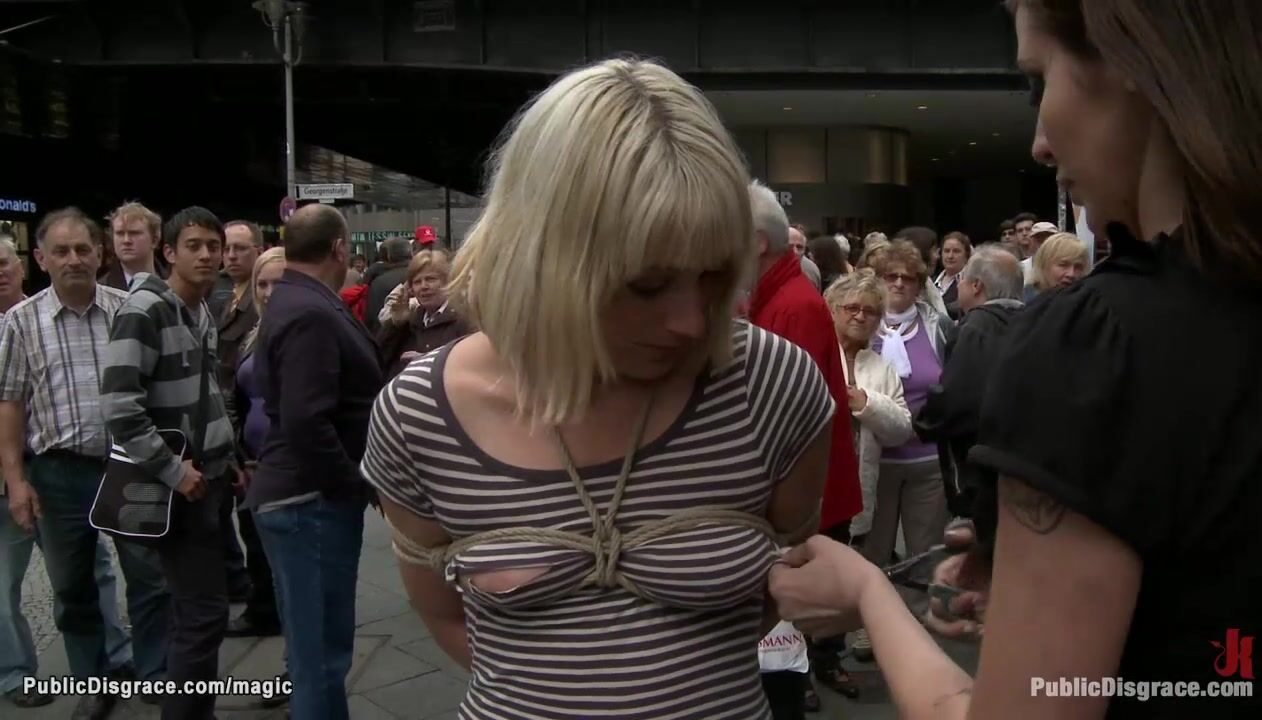Princess Donna Dolore exposes bare boobs bound German blonde babe Uma Masome in public then big cock Steve Holmes anal fucks her in subway