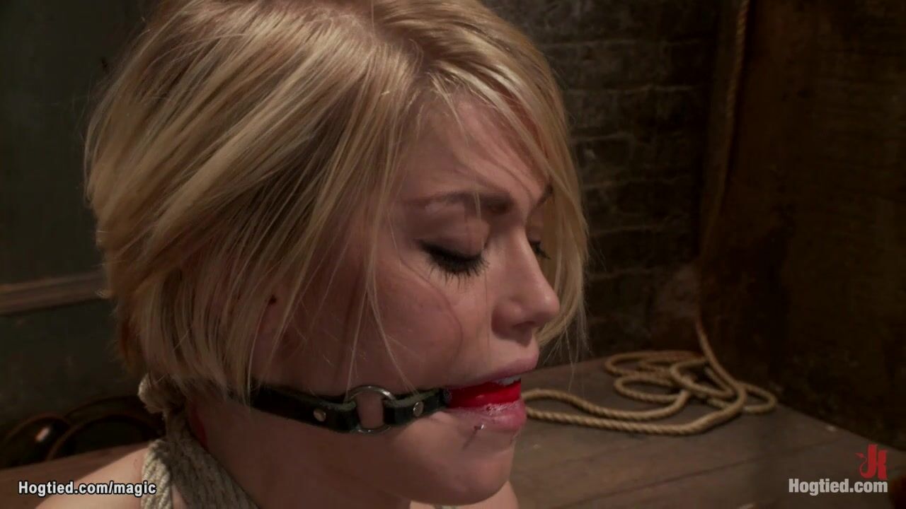 Little blonde slave Ash Hollywood is bound on the floor with ankles bound to neck then gets spanked and pussy finger fucked by master Matt Williams on hogtied