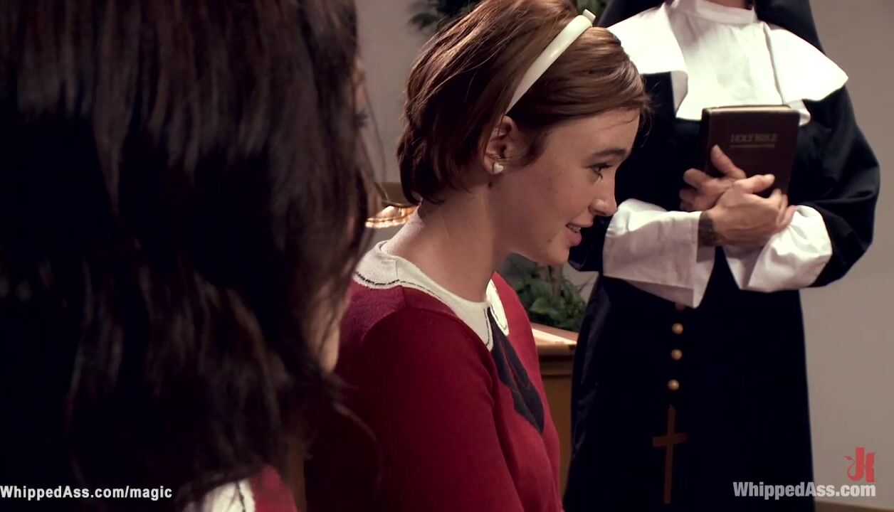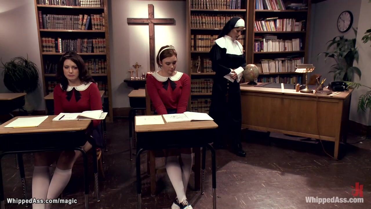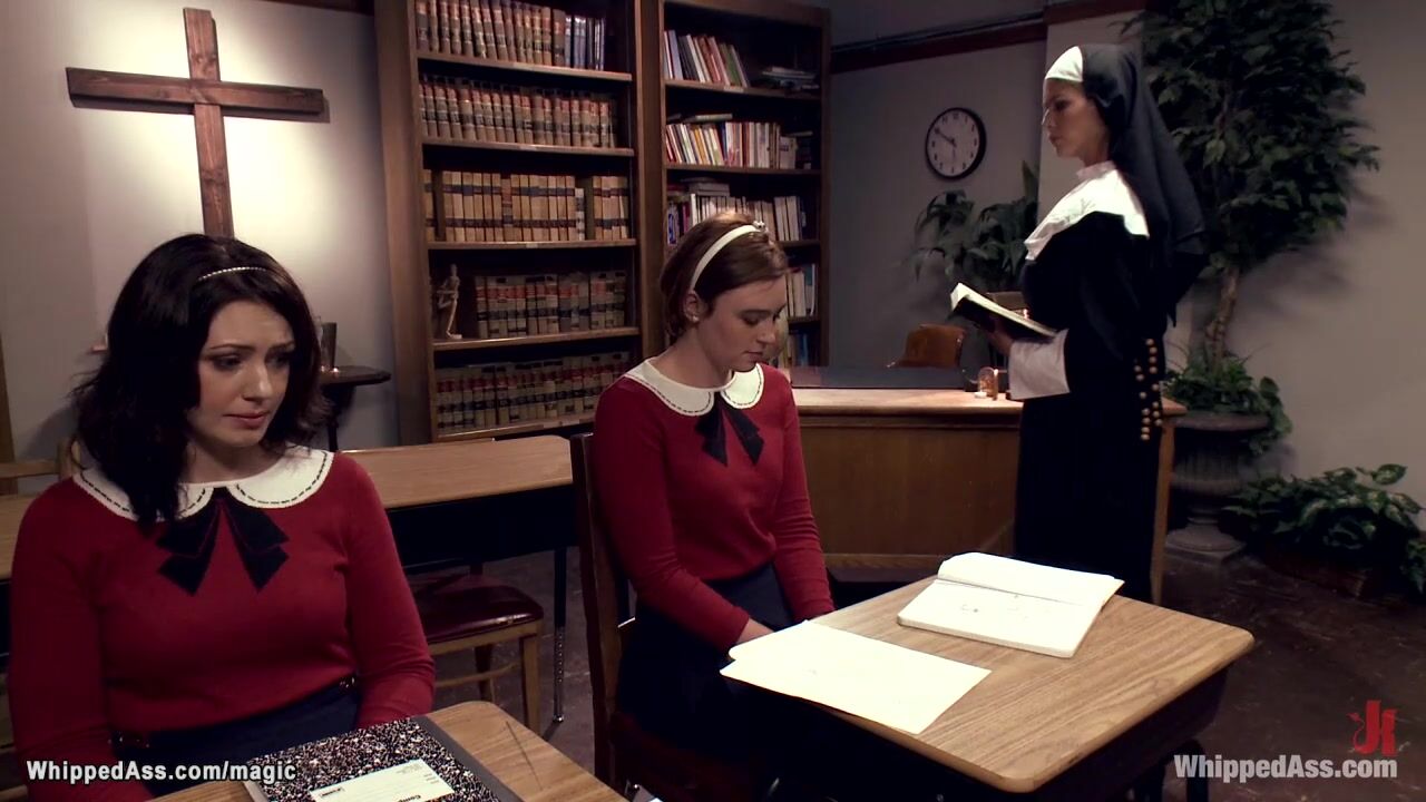 Huge boobs brunette MILF nun Felony binds and whips sinful coeds Jodi Taylor and Sarah Shevon then fucks them with strap on cock on mattress