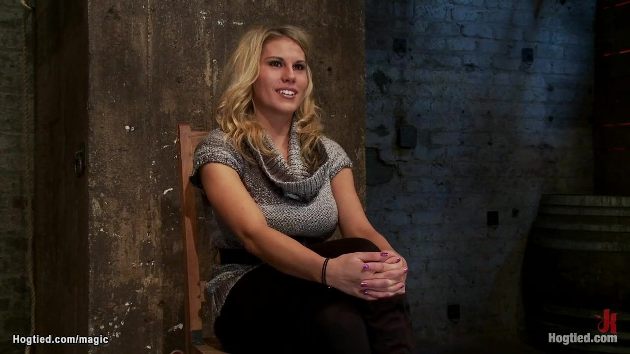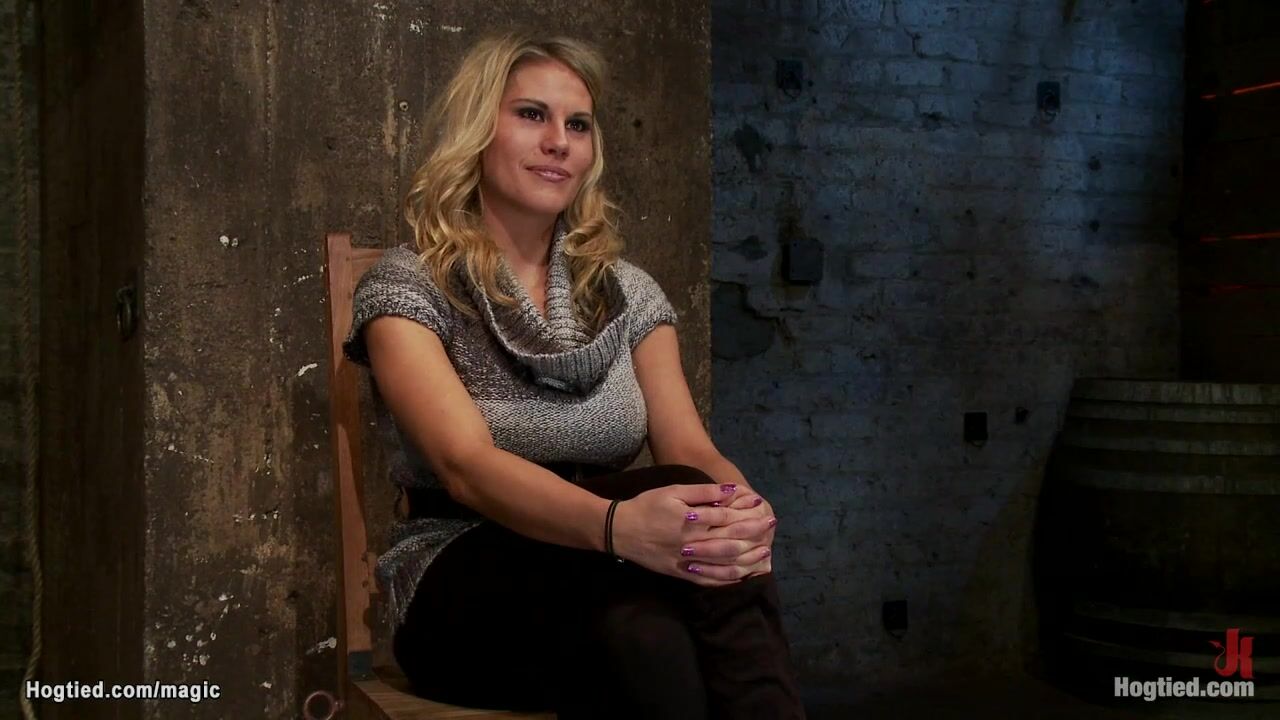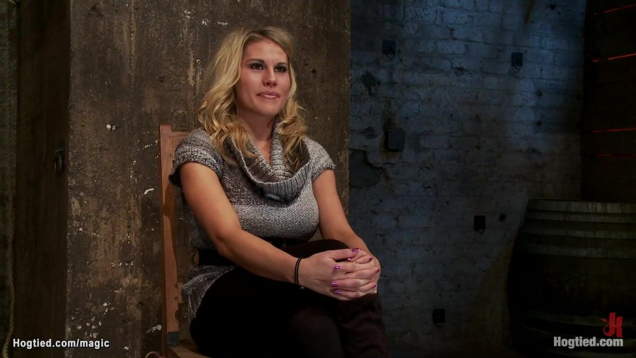Big boobs gagged blonde slave Charisma Cappelli gets ankles bound to wrists and both bound to spreader bar with nipples clamped and bound to bar too gets pussy fingered and vibrated