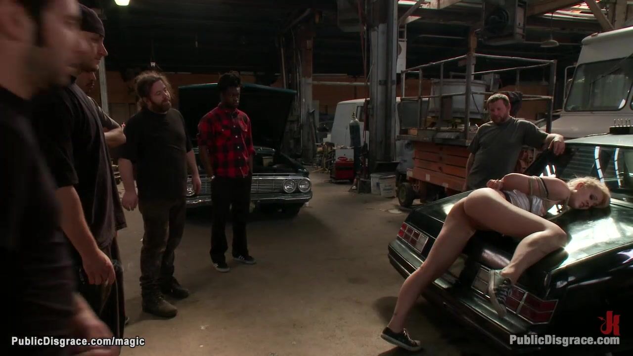 Blonde slut Dylan Ryan with bound hands in box tie behind back dragged in public auto repair shop where vibed and spanked and deep throat fucked by big dick master Tommy Pistol