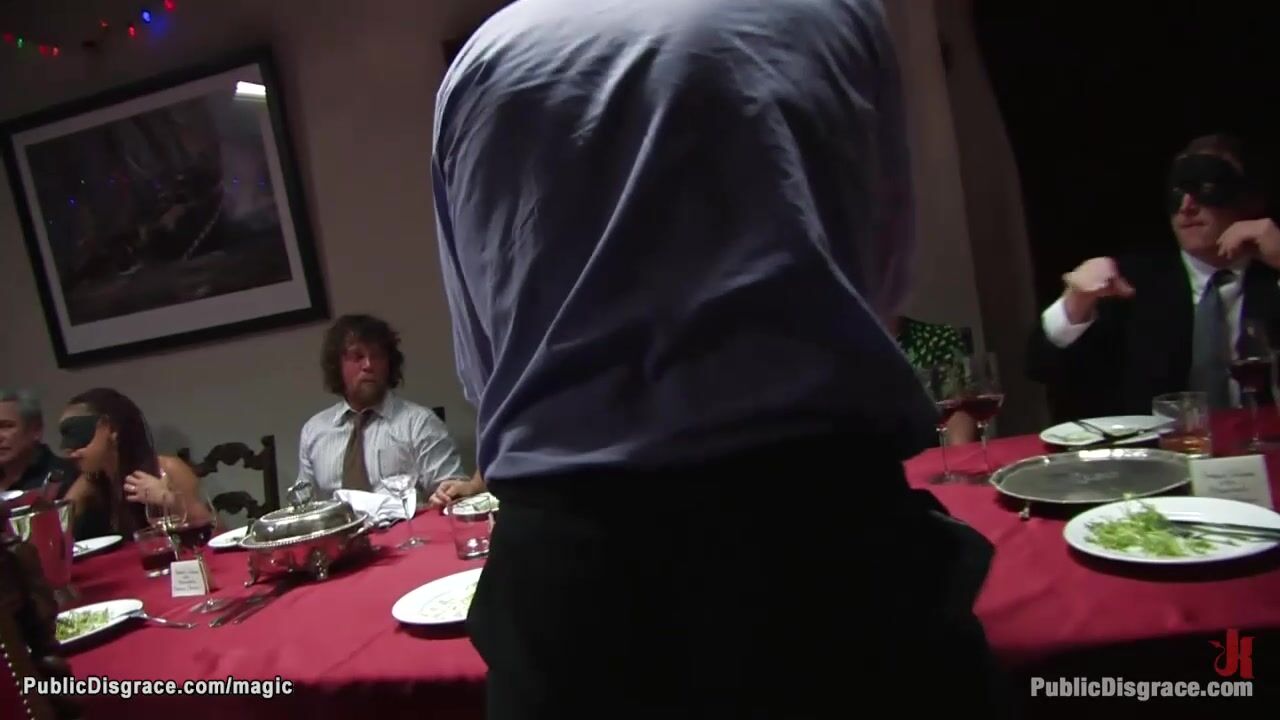 Naked big tits brunette slave Charley Chase is hogtied on dinning table at public party then interracial gang bang fucked by strangers