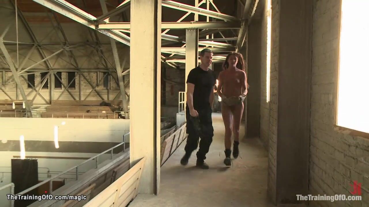 Stunning skinny brunette trainee Cassandra Nix with hands in box tie gets flogged by master James Mogul then locked in stock table pussy vibrated