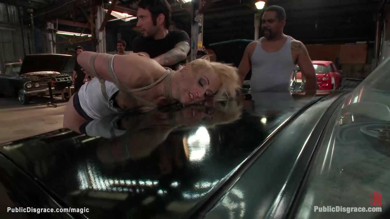 Hot ass blond slave Dylan Ryan is brought in public auto body shop by master Tommy Pistol and then humiliated and anal fucked with big cock