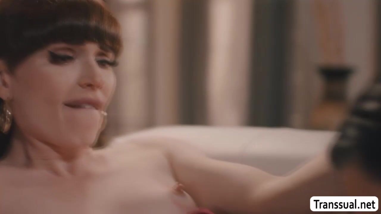 Skinny shemale and her busty friend are on the couch kissing each other.Next is,she lets her friend throat her hard tranny cock passionately.In return,she licks her pussy first to makes it wet and fucks it so deep and hard.