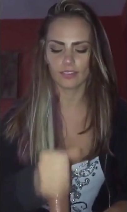 Blonde babe gives a handjob to her horny lover with her clothes on.