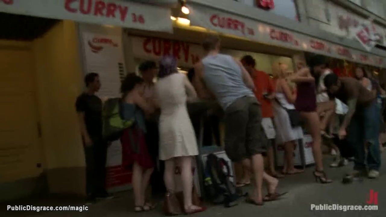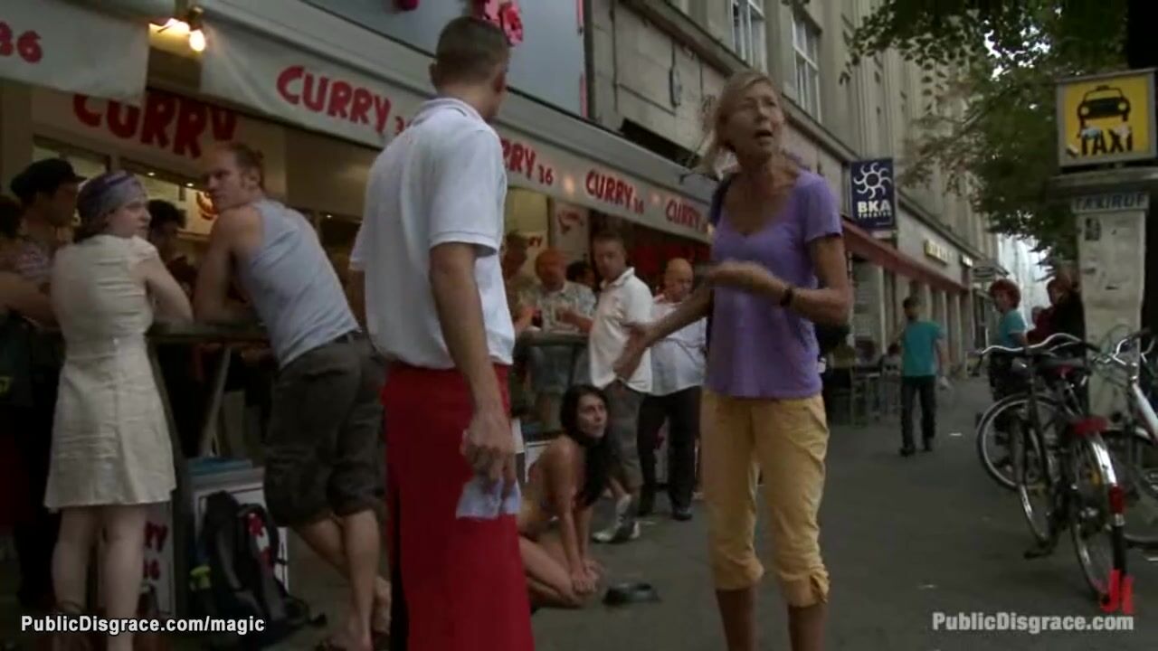 Gagged bare boobs Euro brunette slut Felicia D with panties down on knees walked in public truck parking then rough banged by big dick Tommy Pistol