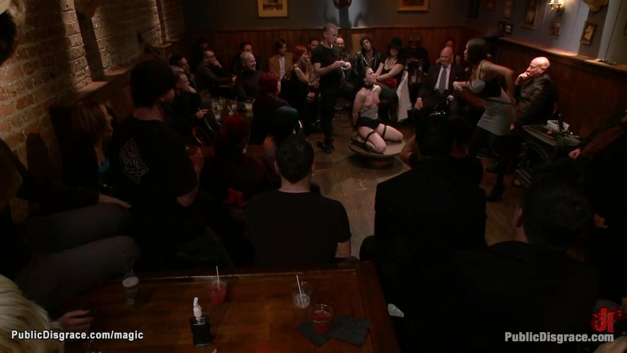 Brunette slave Cheyenne Jewel is bound in doggy position with head in wooden box and gets anal fingered and pussy fucked in crowded public bar