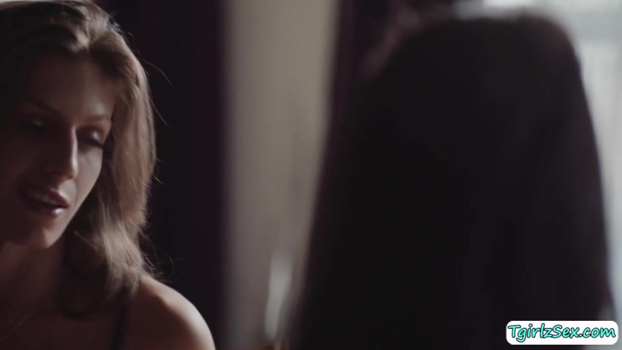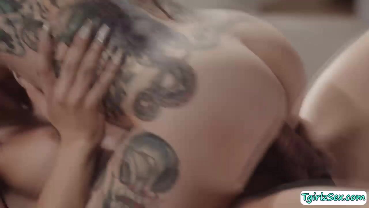 In the couch, big tits brunette shemale Jade Venus talks to her busty tattooed stepmom Joanna Angel but they soon begin kissing. They do tit sucking then orally service one another as the big boobs milf deephroat blowjobs her big tranny cock before a pussy pounding.