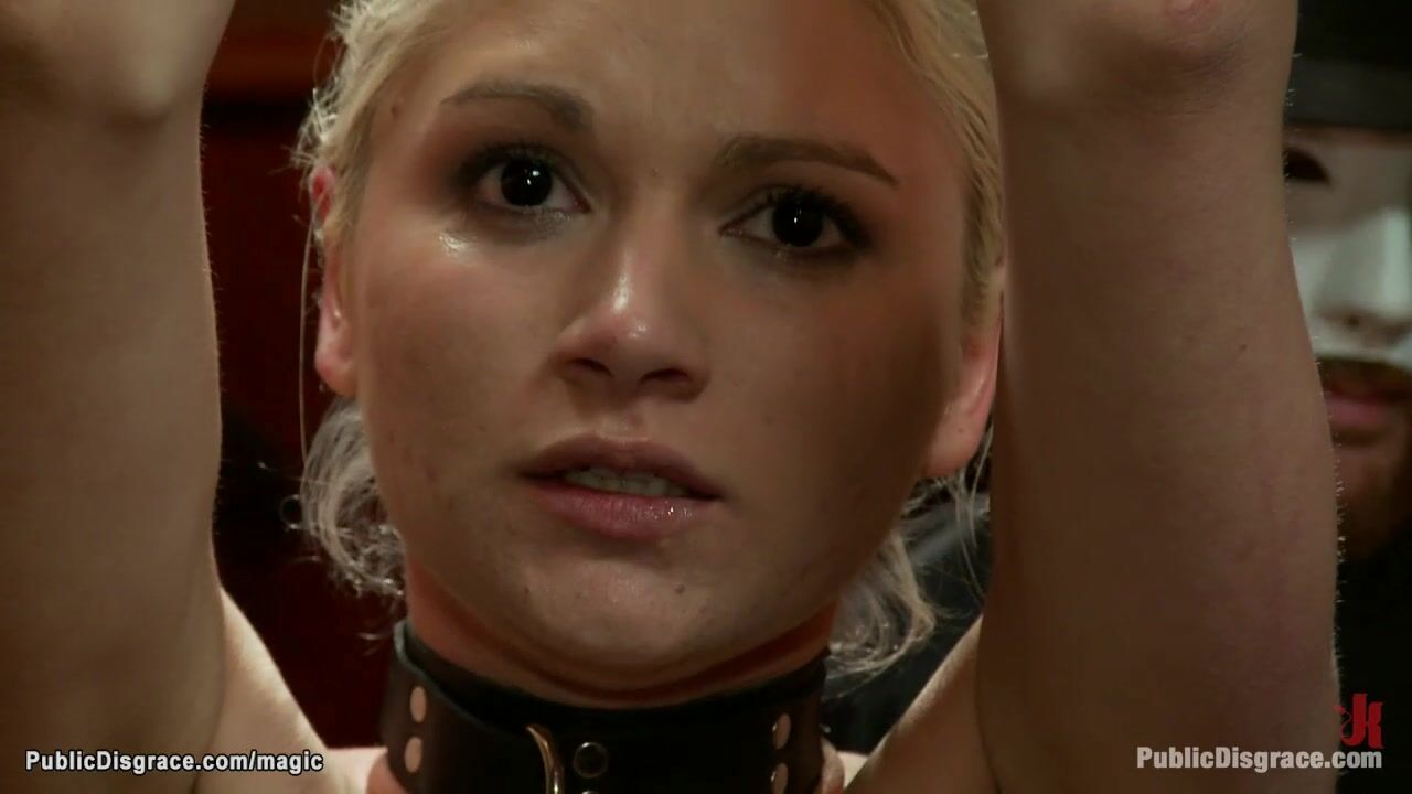 Sexy blonde slave Natasha Lyn is bound in standing position and clamped then gets whipped and groped and group fucked in public bar