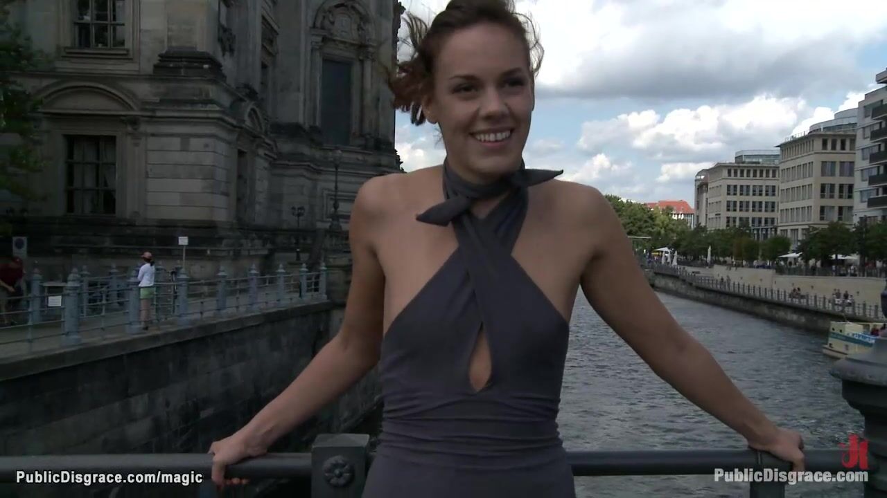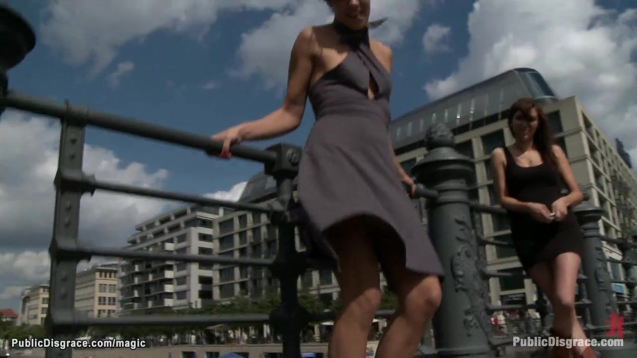 Euro German babe Black Lady in summer dress wears remote controlled vibrator plugged by dom Princess Donna Dolore and walks in crowded public streets