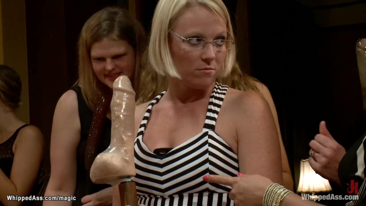 Blindfolded lesbian Justine Joli is bound and hard whipped then laid on the couch with legs spreaded gets pussy fucked by all girl group
