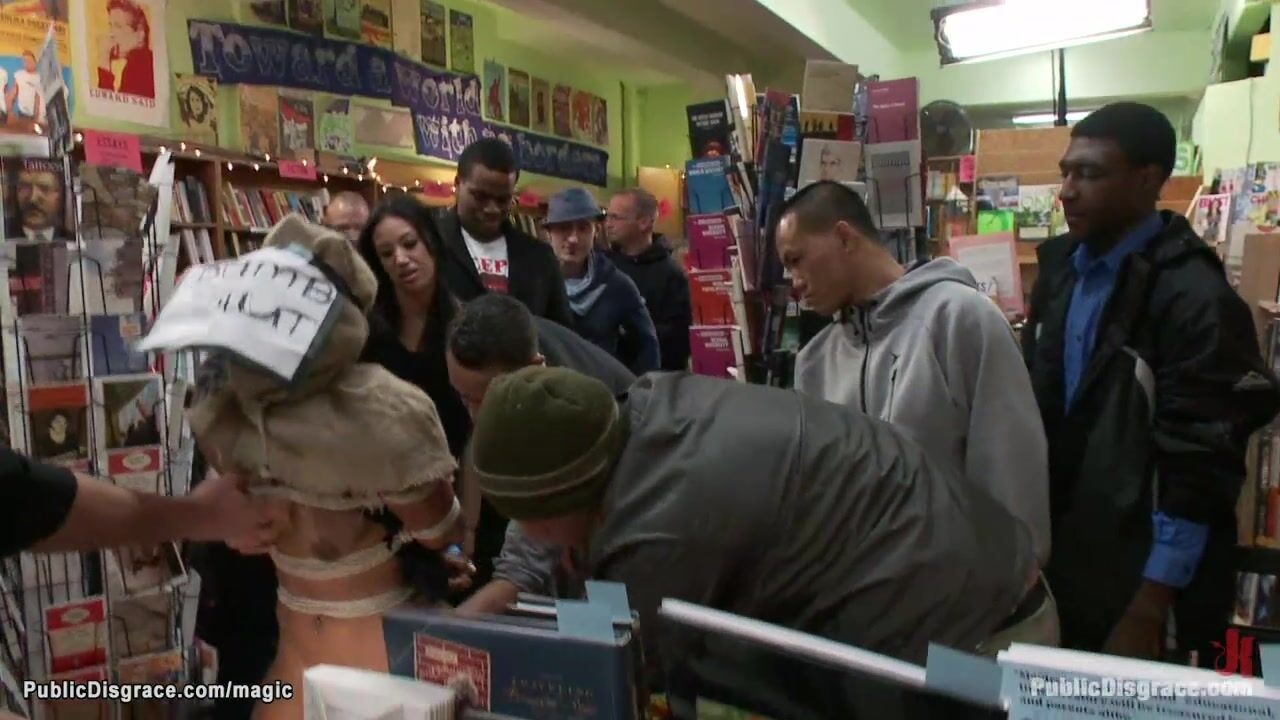 Dom Princess Donna Dolore drags bound ebony babe Leilani Leeanne in crowded public book shop and makes her anal fuck with strangers