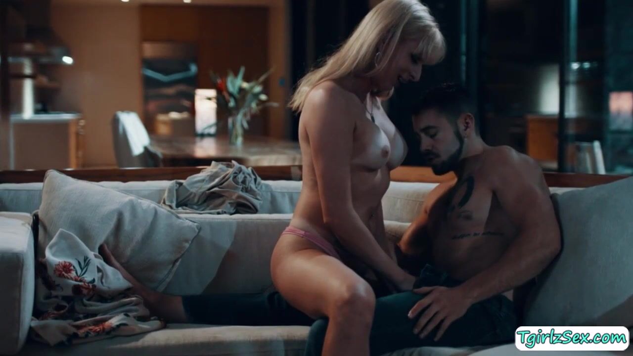 Musclular straight guy Dante Colle flirts with busty blonde shemale Jamie French in the couch kisisng and tti sucking her big boobs. Later on, the hunk stud stretch her big ass to hardcore anal bareback doggystyle after he rimjobs it moaing in orgasm.