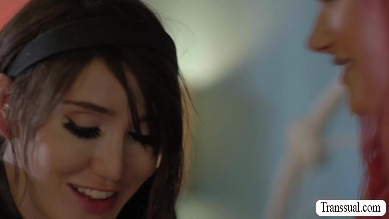 TS brunette and her pink haired stepsister are on the bed talking.After that,they get horny and start kissing and sucking their nipples passionately.Next is,she lets her stepsis throat her tranny cock before she fucks her tight wet pussy so hard.