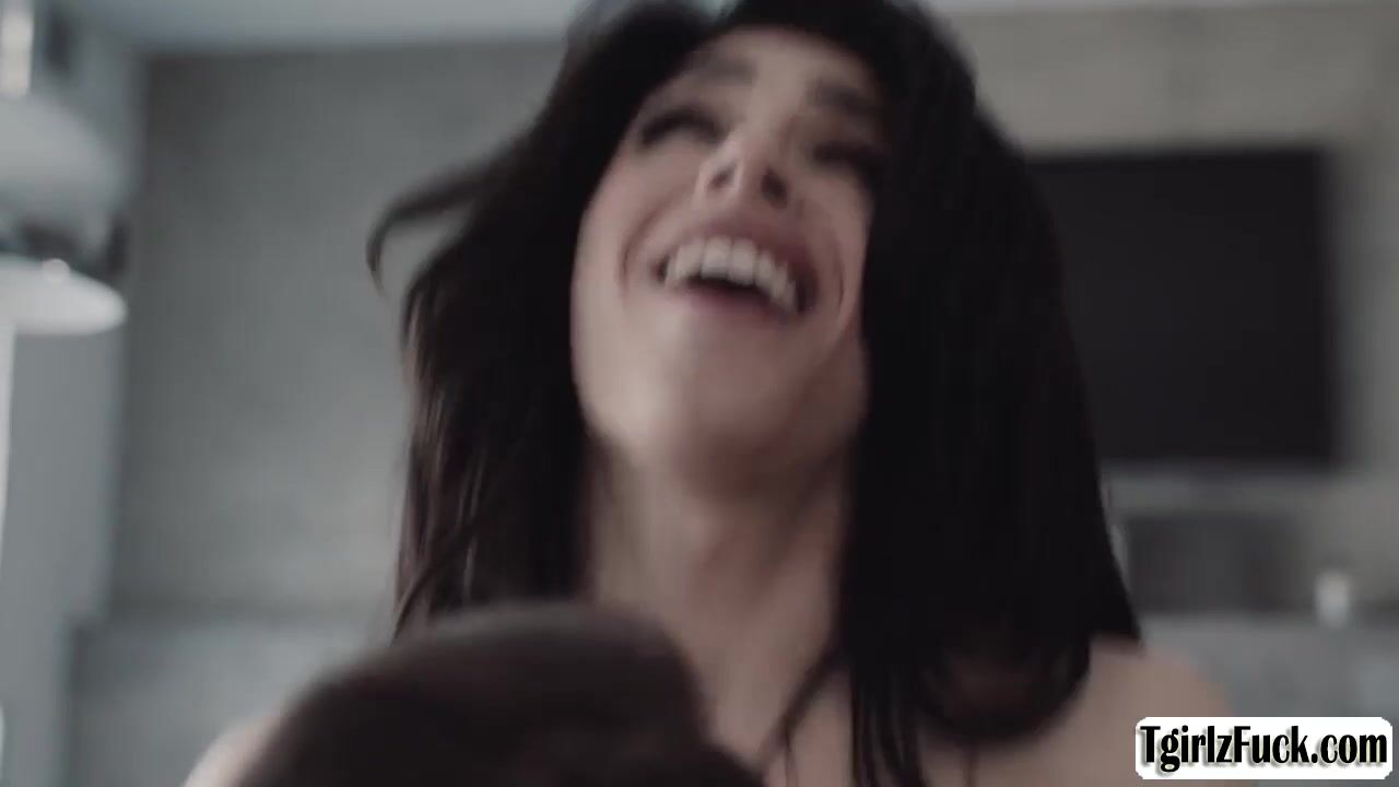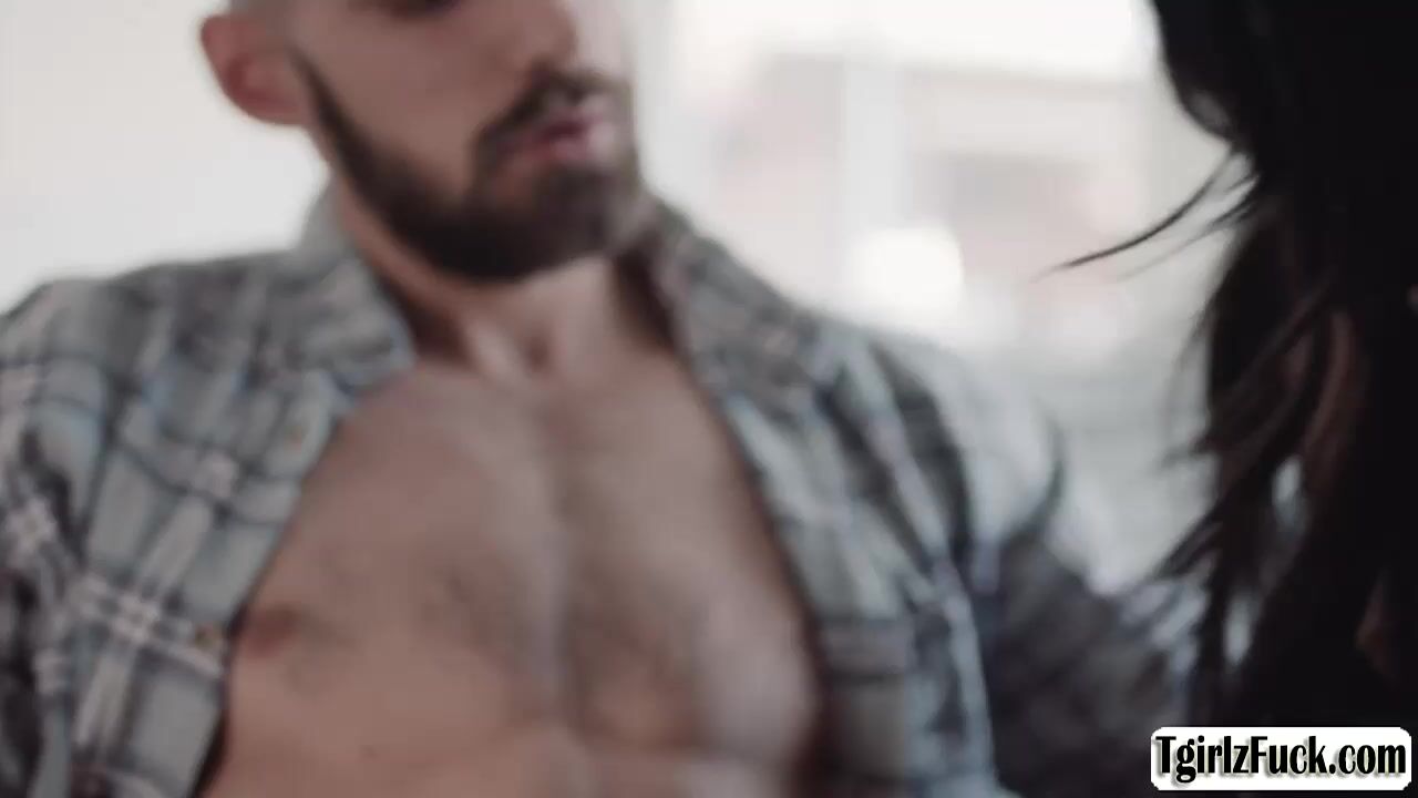 Small tits transexual Ariel Demure flirts with masculine straight guy Johnny B kisisng him while caresing his big hard cock. Soon, the brunette shemale bows down to deepthroat blowjob his dick and rides it to a hardcore anal bareback missionary and doggystyle.