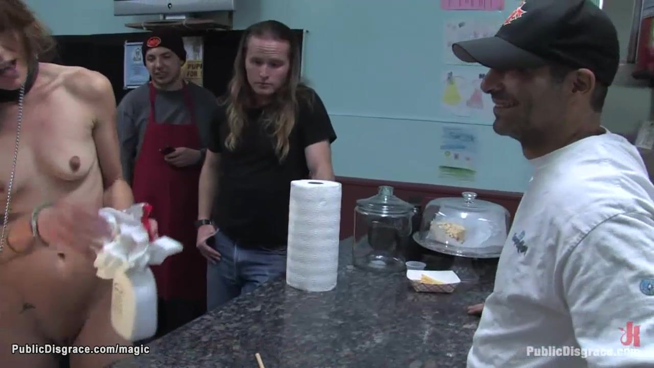 hot brunette slave Delilah Knight is bound in public bar by master Mark Davis and Princess Donna Dolore then treated like a pet and fucked