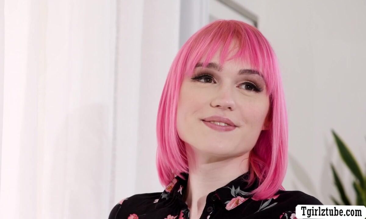 Trans pink haired Claire Tenebrarum and Marilyn Johnson first met online but are now seeing each other in person.They have some toast and then they start kissing each other on the couch.Next is,Marilyn throats TS Claires shecock and rides it after.